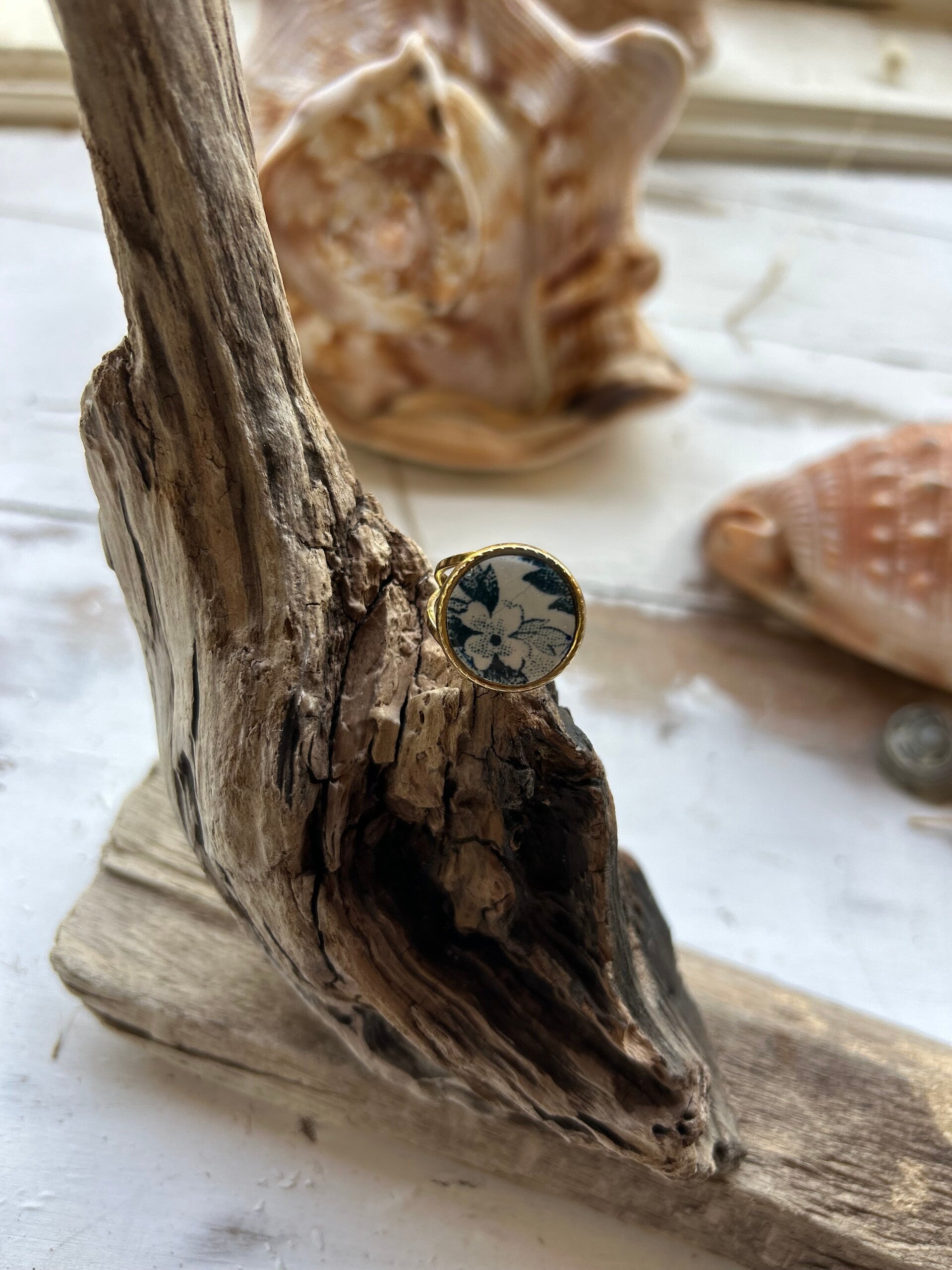 Cette bague élégante est ornée d'un fragment d'assiettes Saint Amand modéle Marie Louise soigneusement découpé dans une assiettes