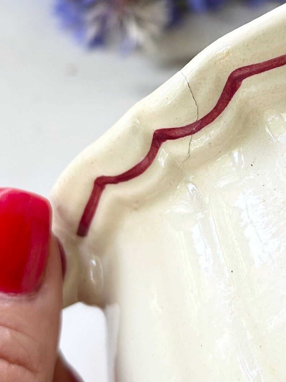 • État : bonne condition générale. Légère fêlure à la cuisson, visible sur les photos, mais n’altérant ni l’esthétique ni la solidité de la pièce.