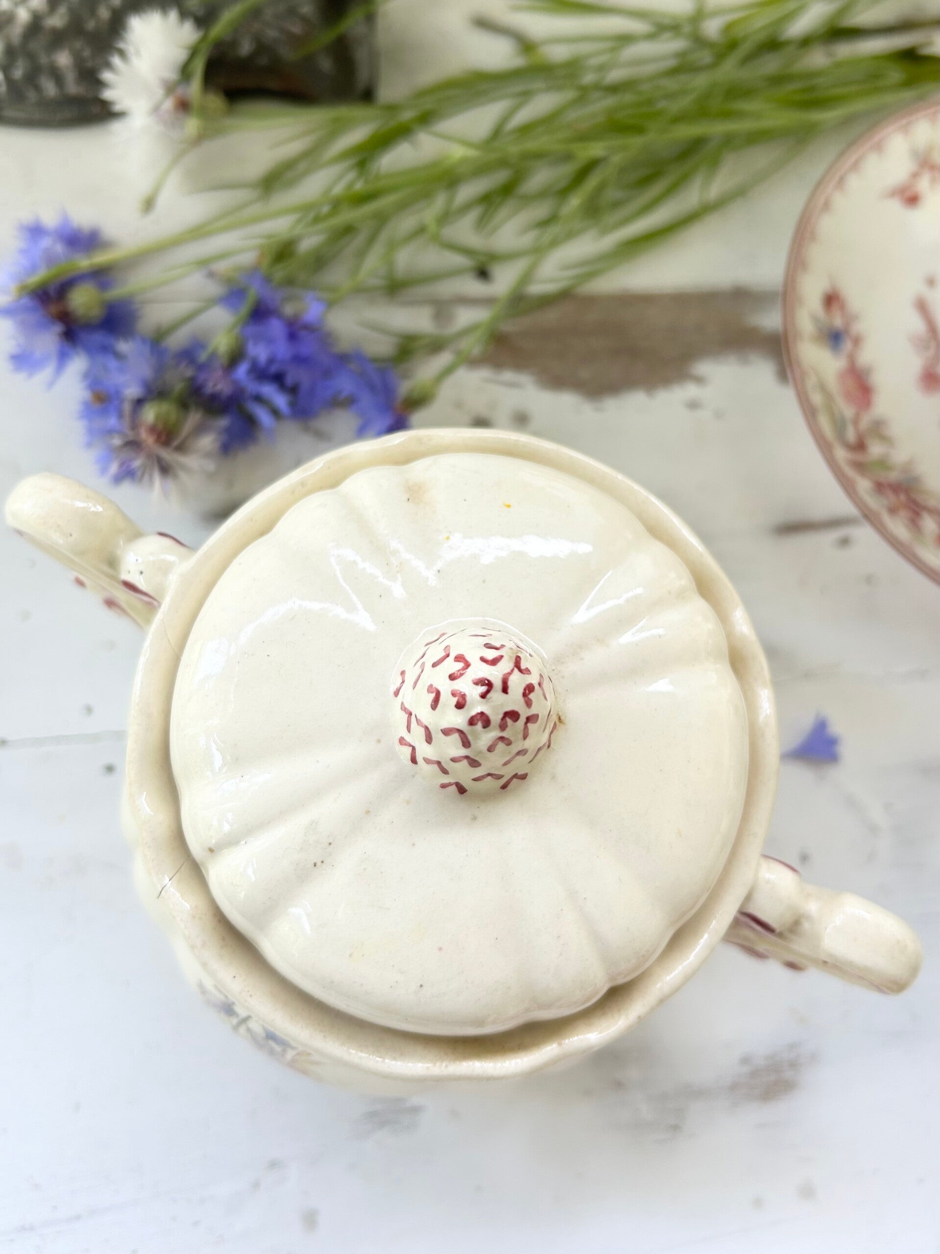 Magnifique sucrier de la manufacture Sarreguemines, modèle Agreste. Ce service iconique séduit par son décor délicat et intemporel, inspiré de la nature et des fleurs champêtres.
