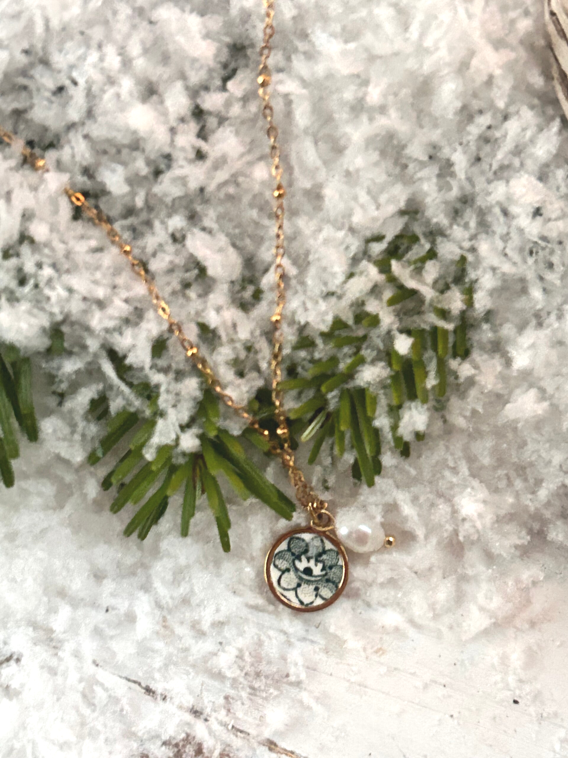 Collier doré en acier inoxydable, agrémenté d’un pendentif circulaire façonné dans une assiette ancienne en faïence Sarreguemines modèle Mignon. Une petite perle rehausse l’éclat du médaillon pour un style raffiné et délicat.