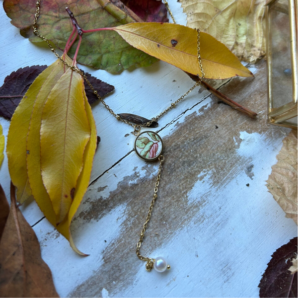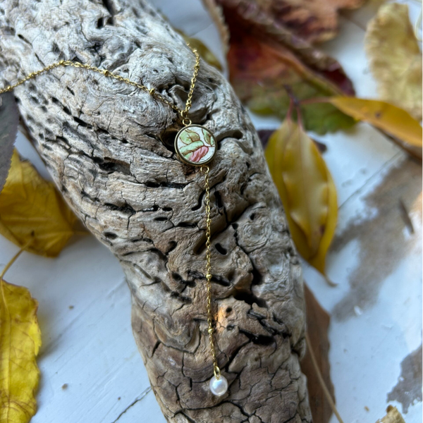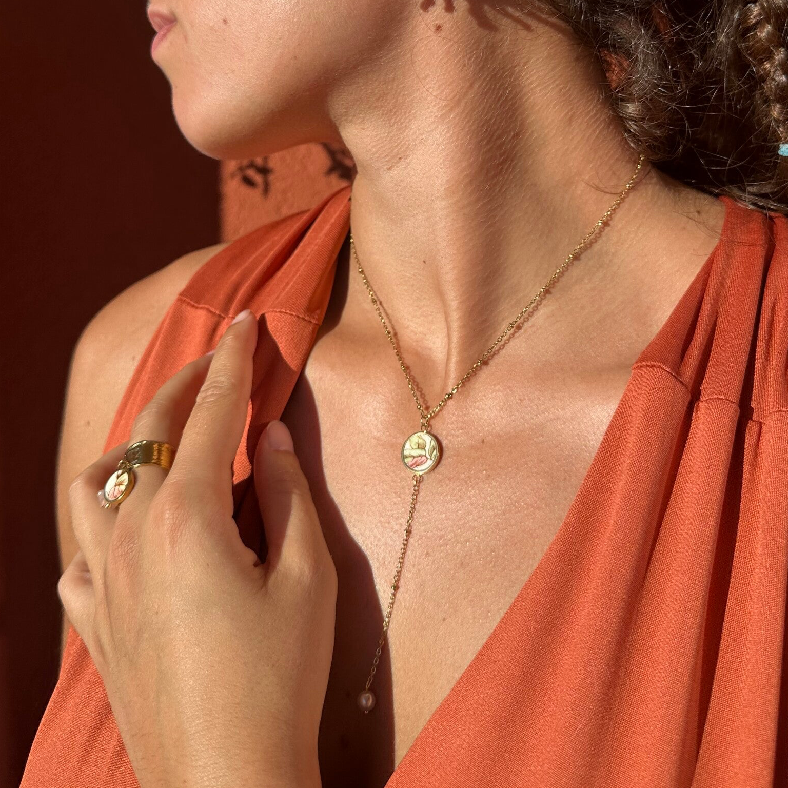 Collier doré en acier inoxydable au design sautoir, orné d’un cabochon en faïence ancienne Terre de Fer anglaise de"William Alsarger Adderley & Co modèle pax taillé à la main. Une délicate perle naturelle termine la chaîne qui descend subtilement sur le décolleté.