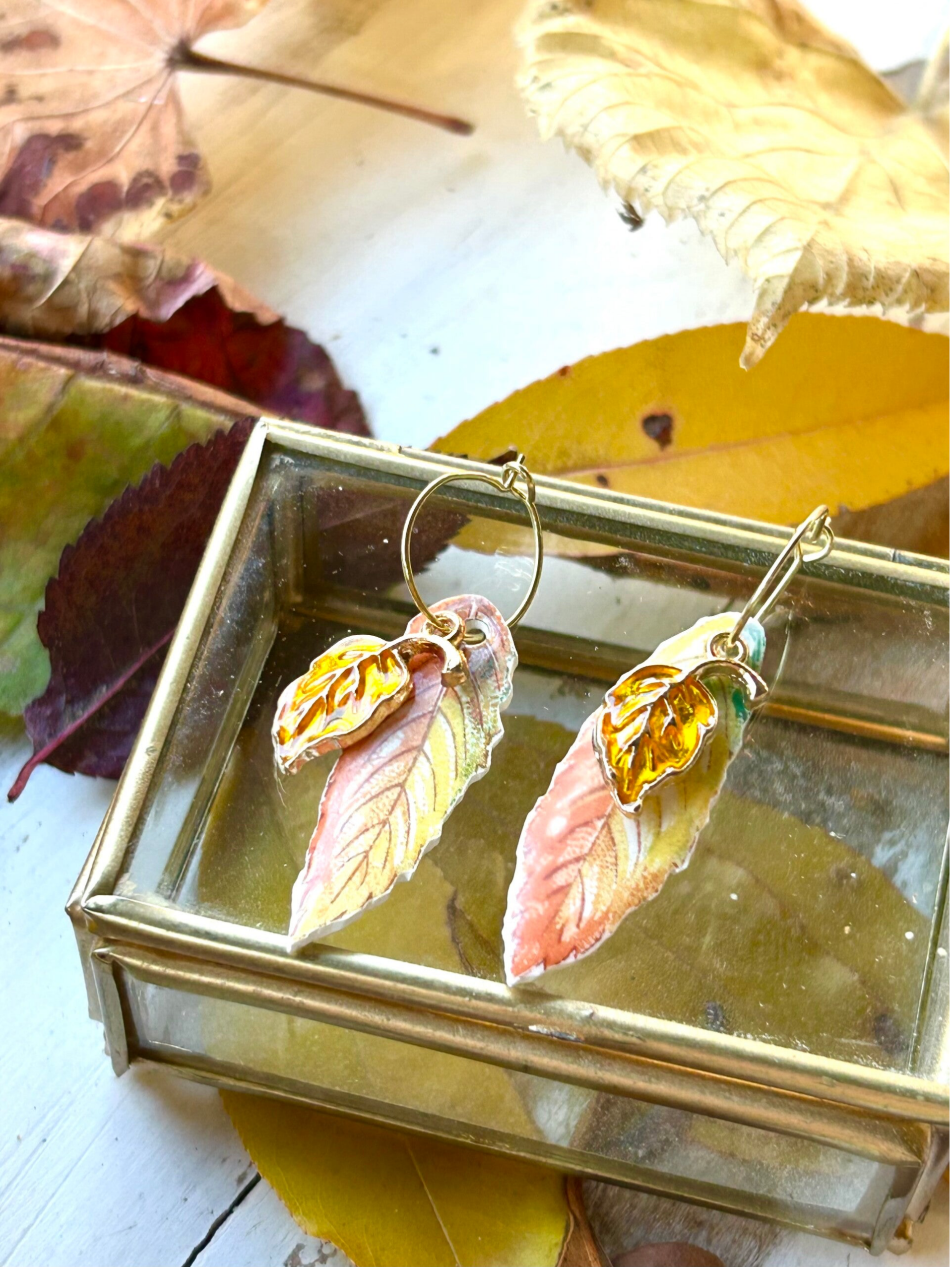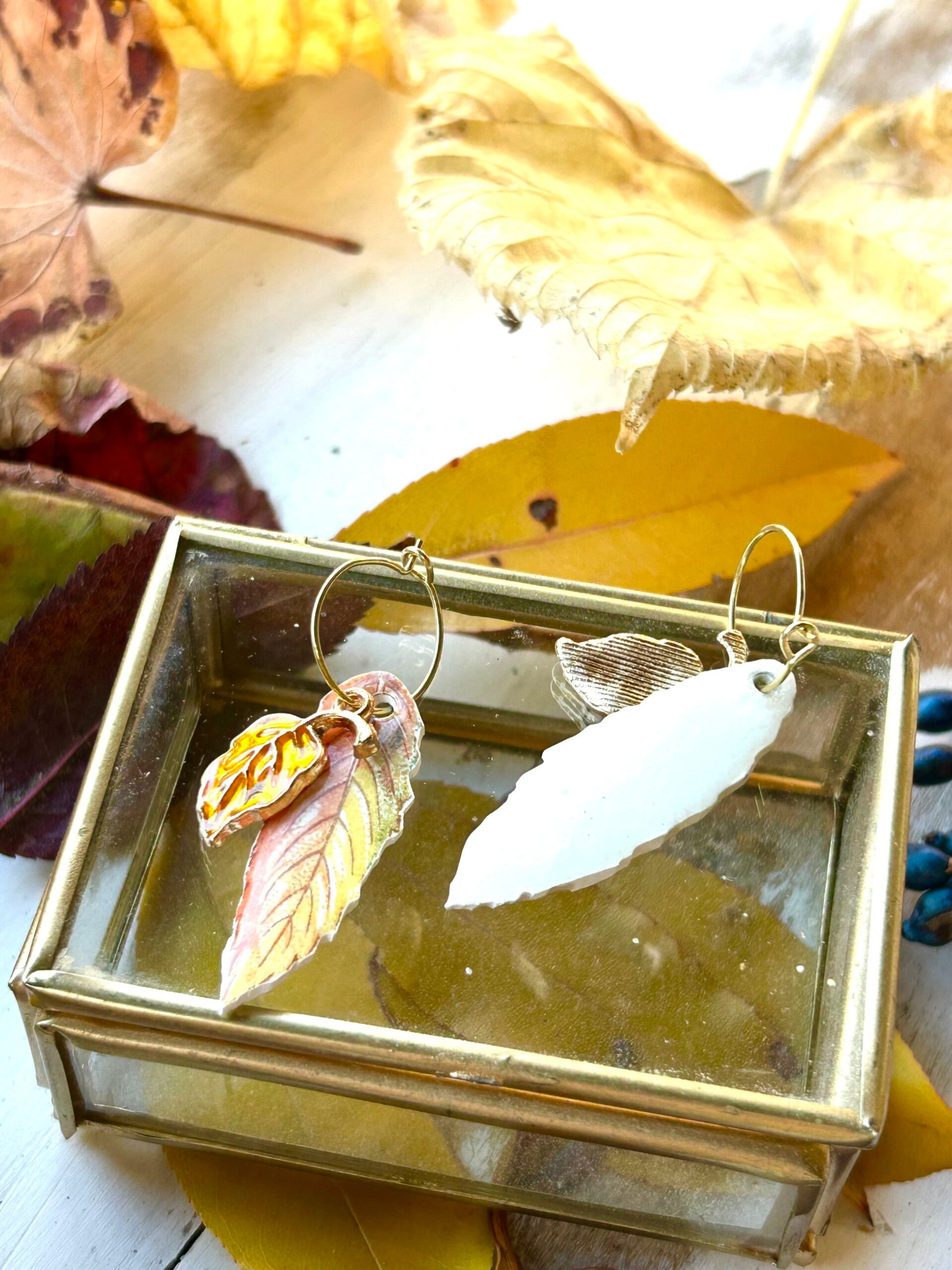 Élégantes et délicates, ces boucles d’oreilles mettent en avant deux fragments de faïence Sarreguemines modéle Némours, soigneusement taillés en forme de feuilles aux teintes chaudes d’automne.