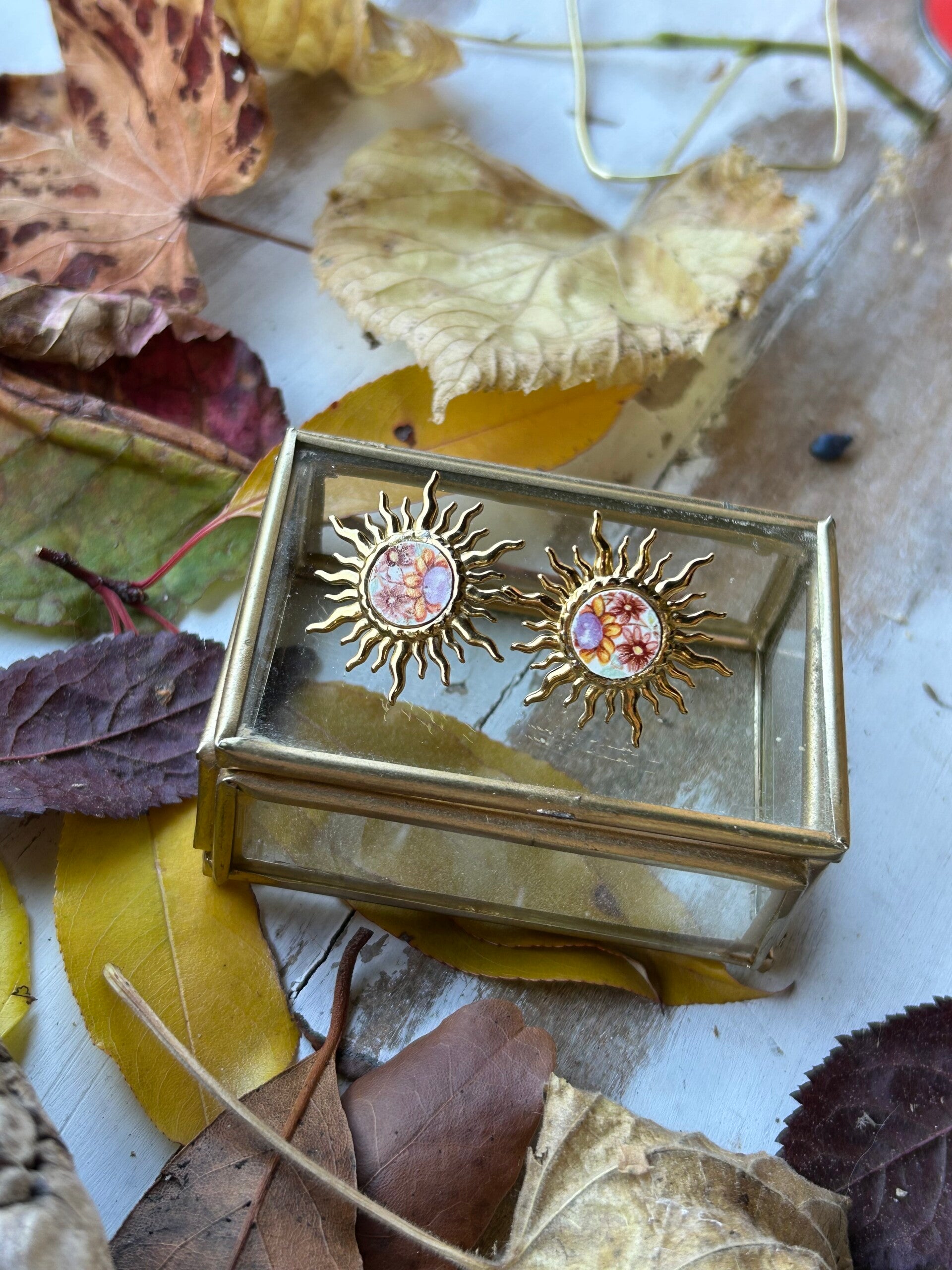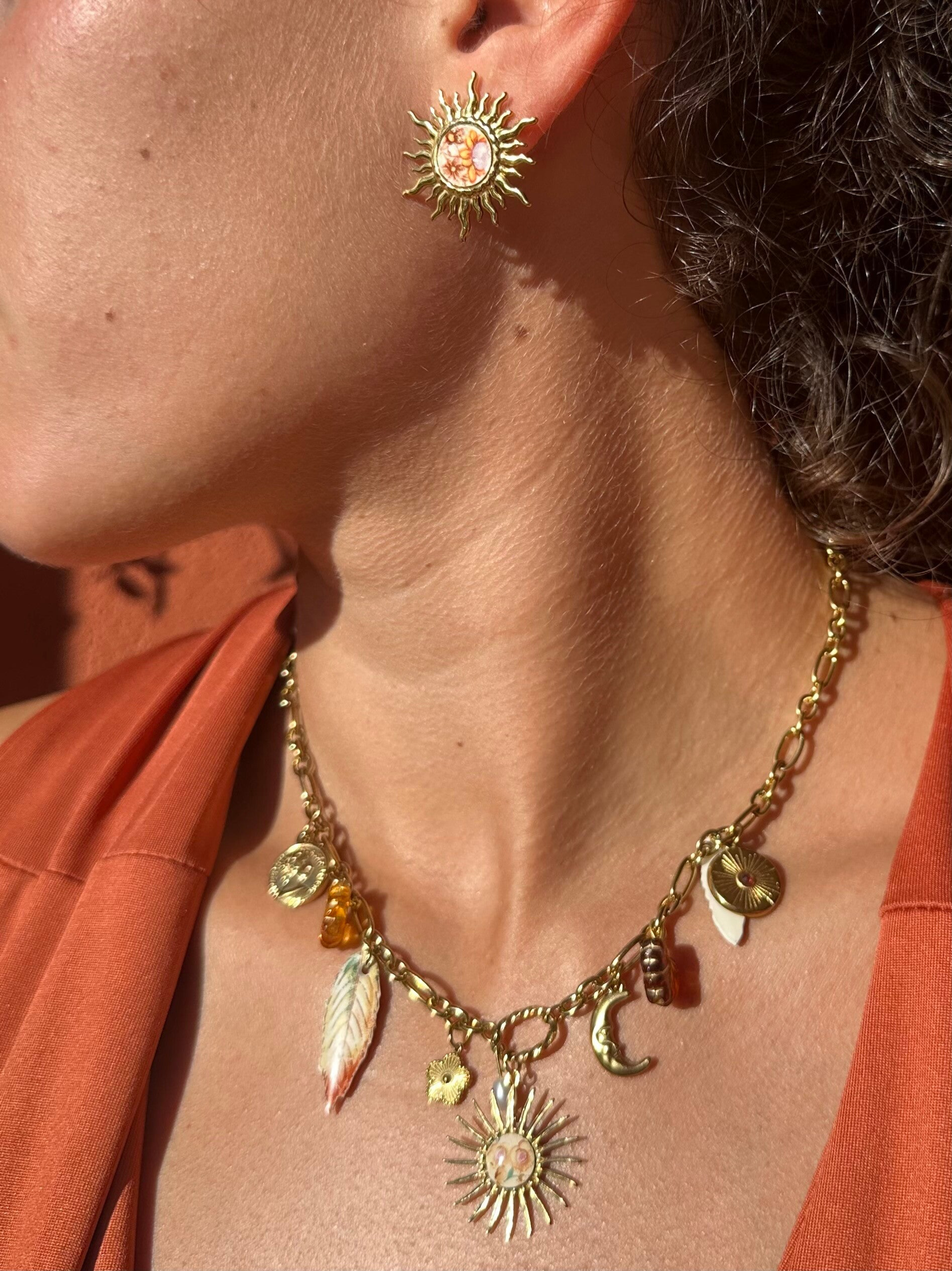 Clous d’oreilles en forme de soleil doré, dont le cœur est taillé dans une assiette ancienne Salins modéle Empire