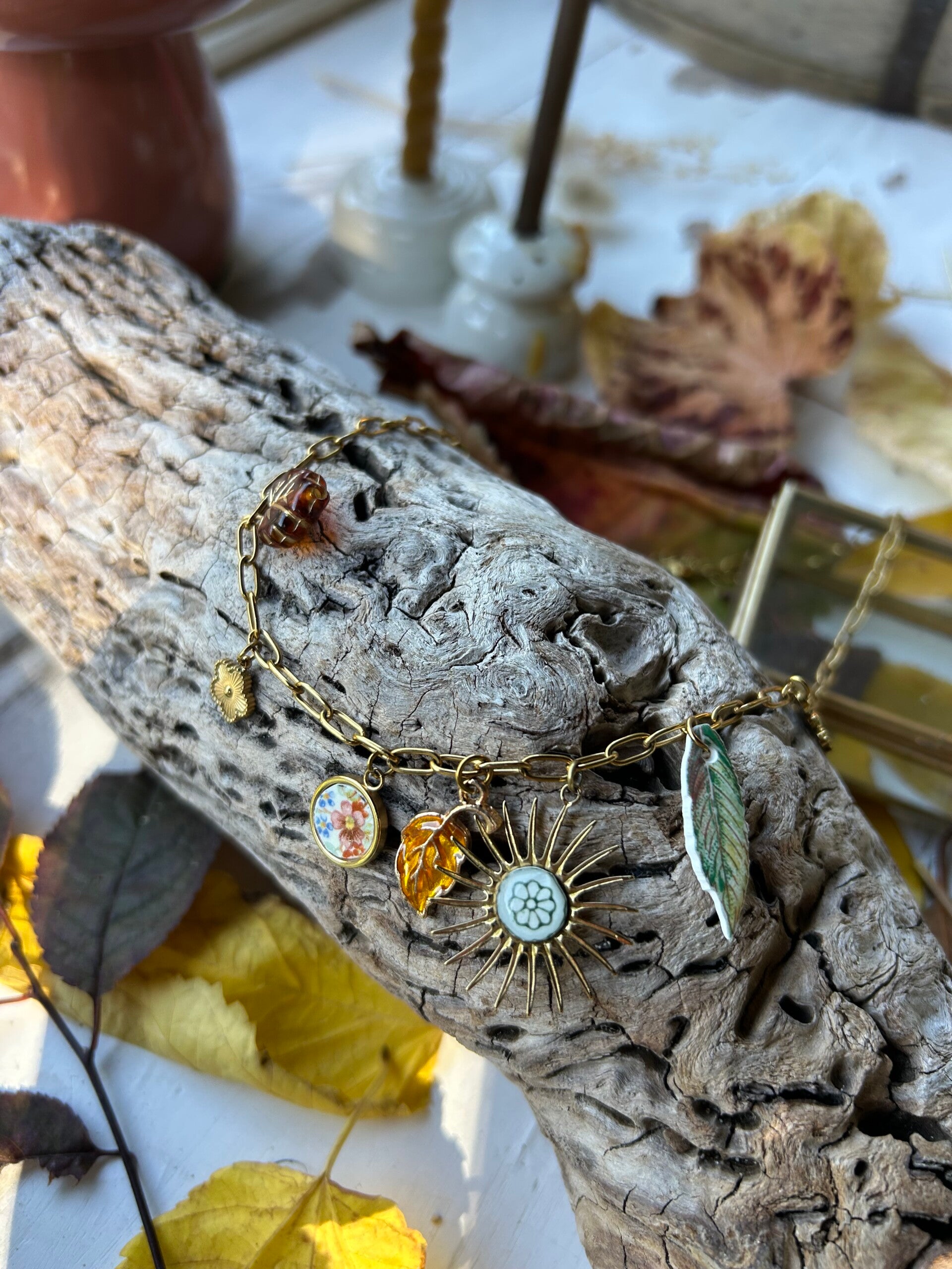 Bijou doré aux accents poétiques, orné de multiples breloques : lune, perles, petites pampilles dorées…