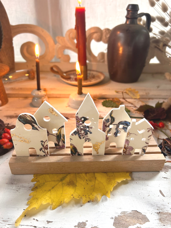 Chaque maison est découpée avec précision dans la faïence, révélant les délicats motifs , puis montée sur un socle en bois naturel.