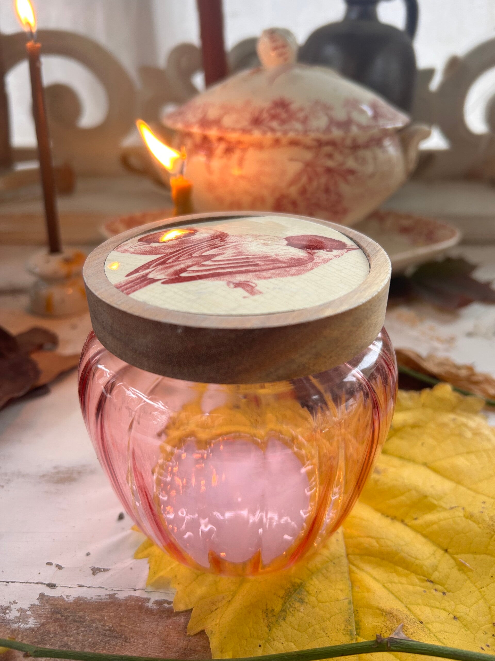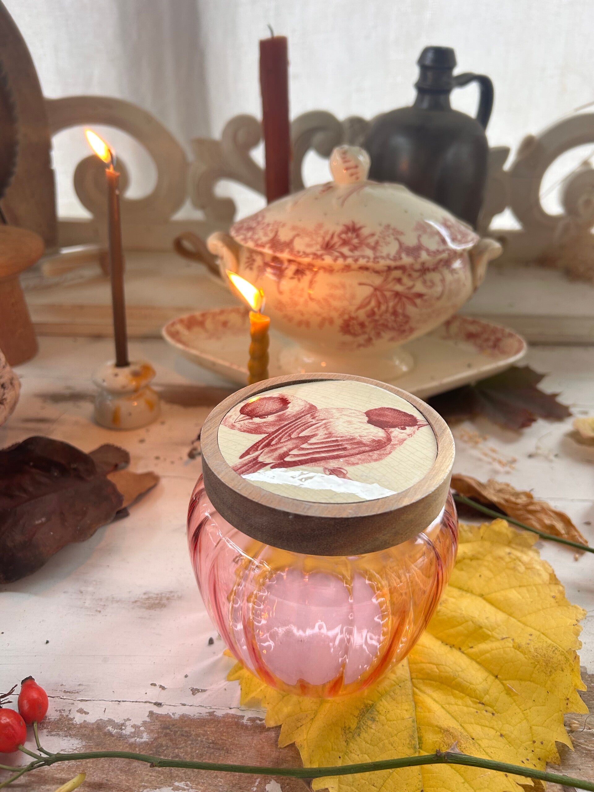 Style & inspiration : Une création délicate où la douceur du verre rose rencontre la poésie d’un décor d’oiseaux ancien, où l’imperfection du relief raconte l’histoire de l’objet