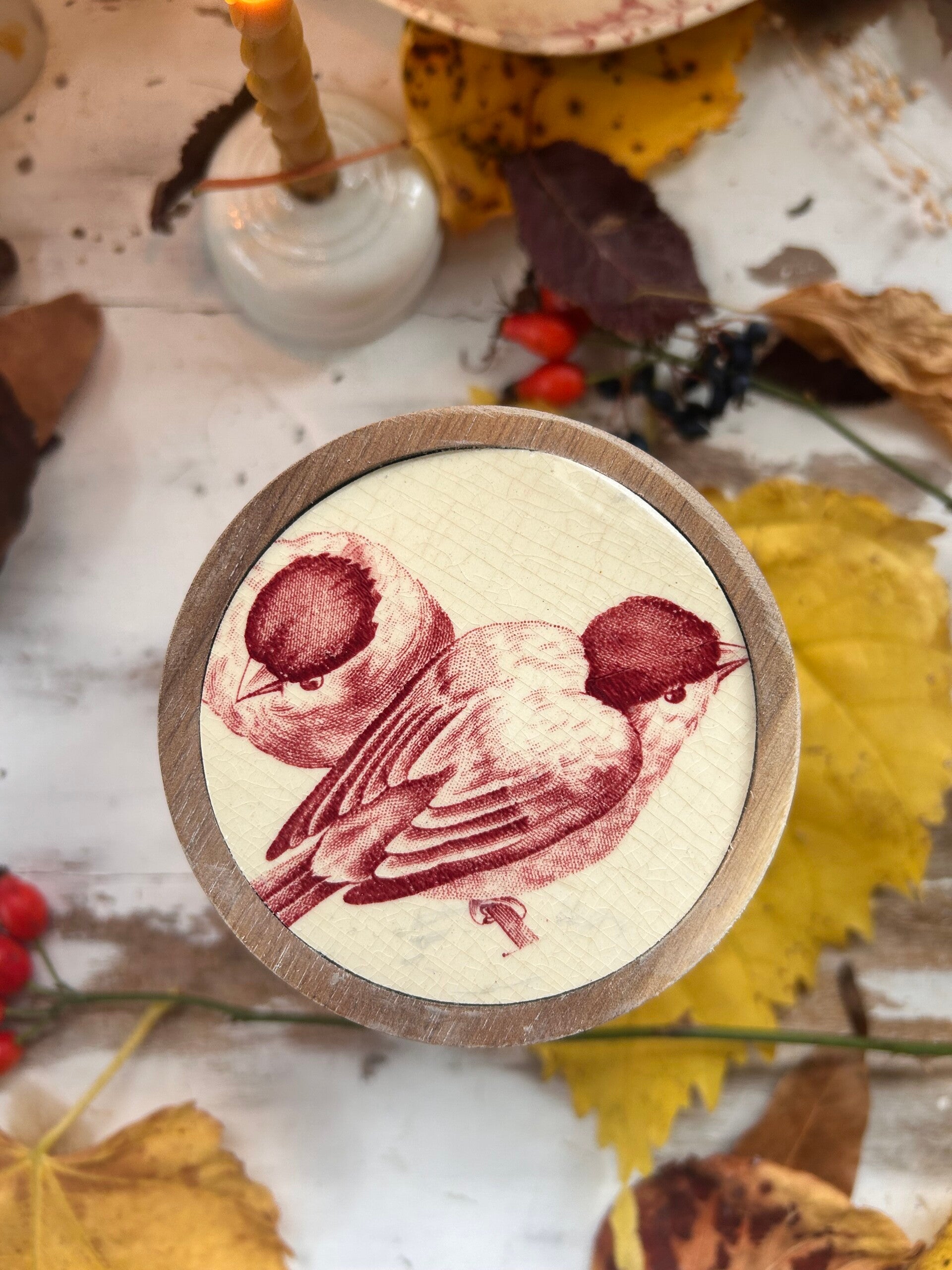Il est orné d’incrustations de faïence ancienne provenant d’une vasque en terre de fer HB & Compagnie modéle Marseille, décorée de deux oiseaux dans de subtiles nuances de rouge.