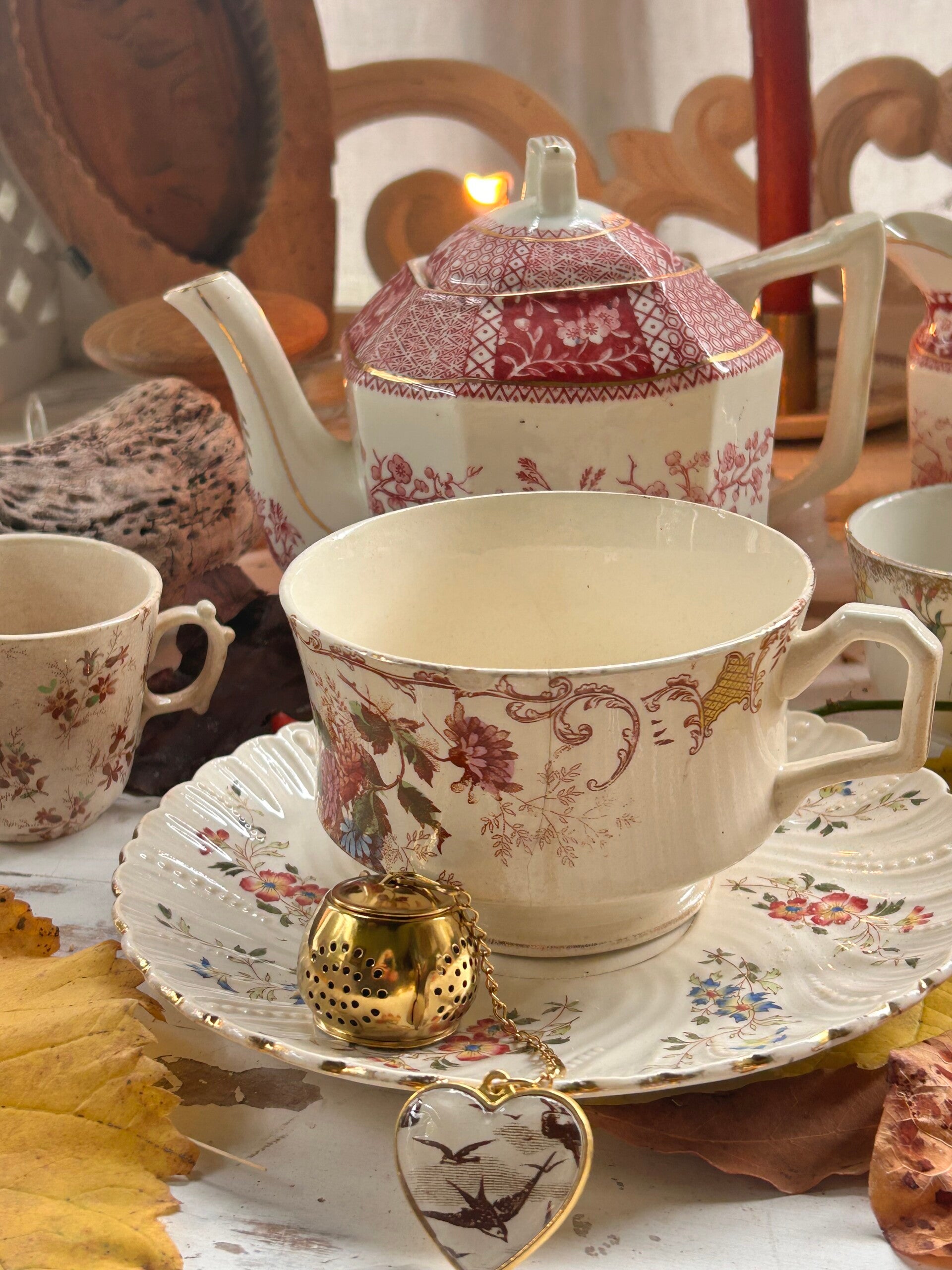 Un infuseur à thé aussi poétique qu’utile. Son pendentif en forme de cœur dorérenferme un fragment d’assiette ancienne en terre de fer HB & Compagnie, décorée de délicates hirondelles en plein vol.