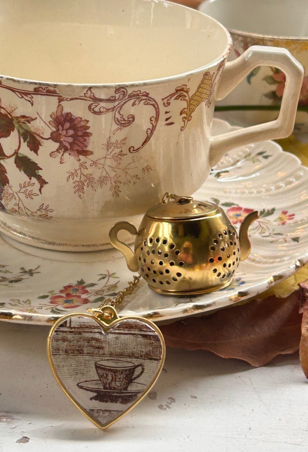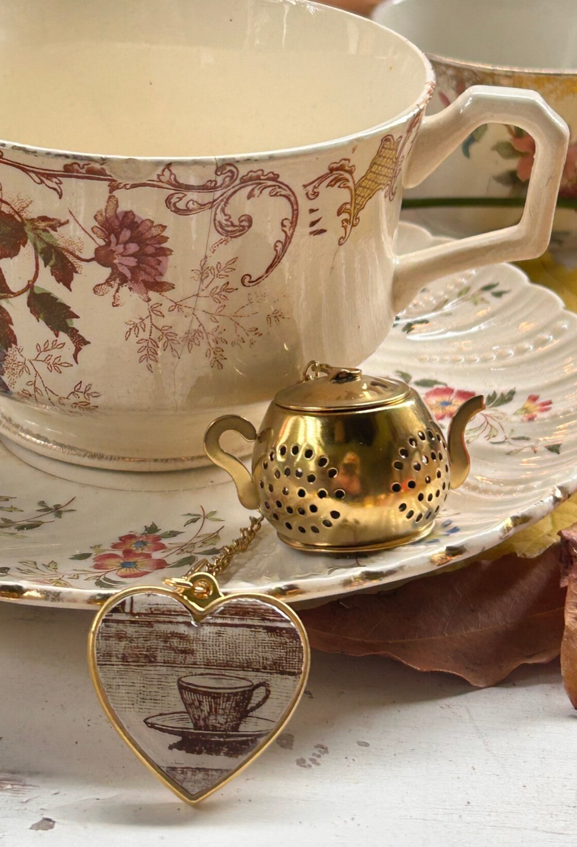 Un infuseur à thé aussi poétique qu’utile. Son pendentif en forme de cœur doré renferme un fragment d’assiette ancienne en terre de fer HB & Compagnie.