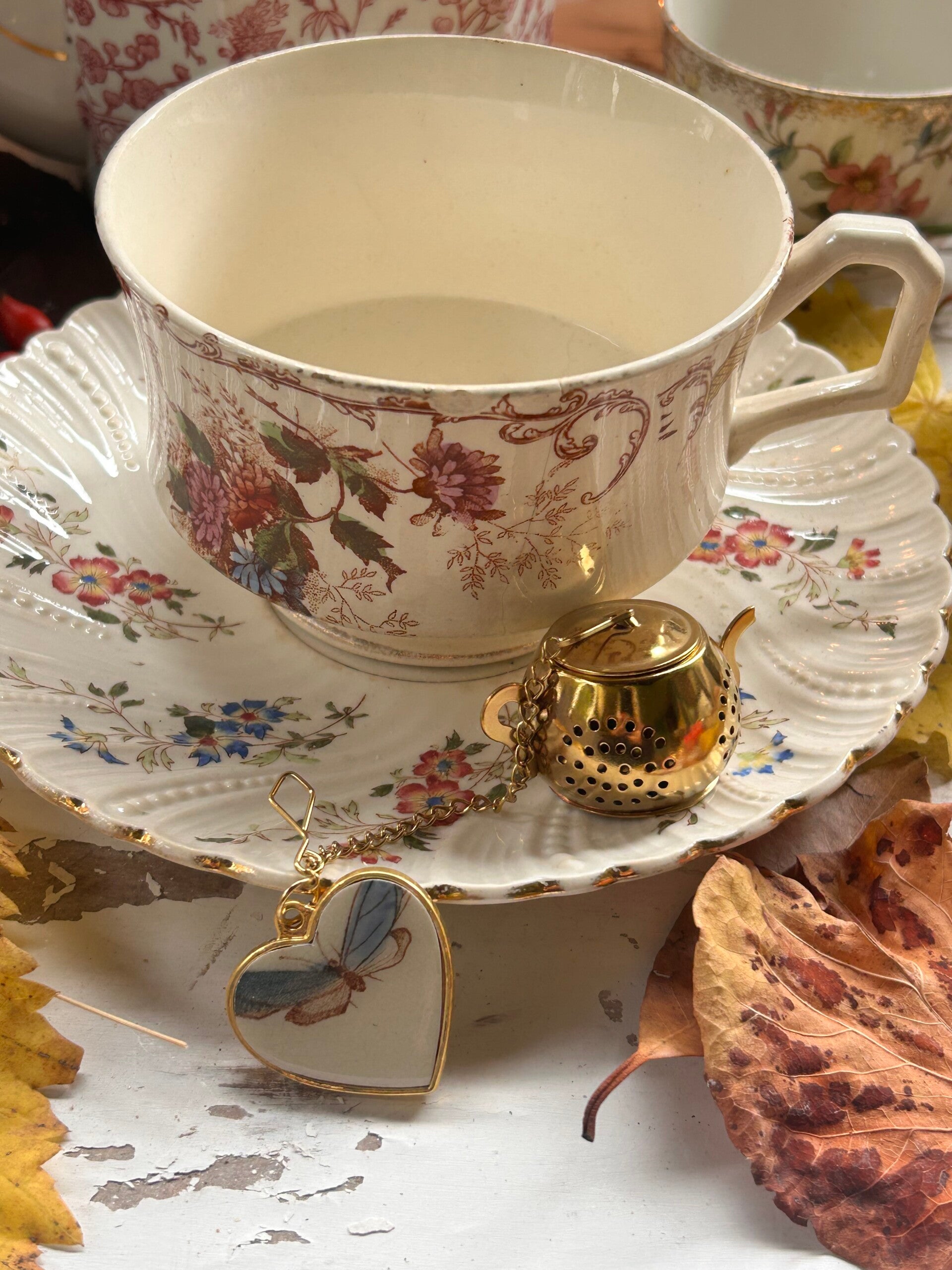 Un infuseur à thé aussi poétique qu’utile. Son pendentif en forme de cœur doré renferme un fragment d’assiette ancienne en terre de fer polychrome