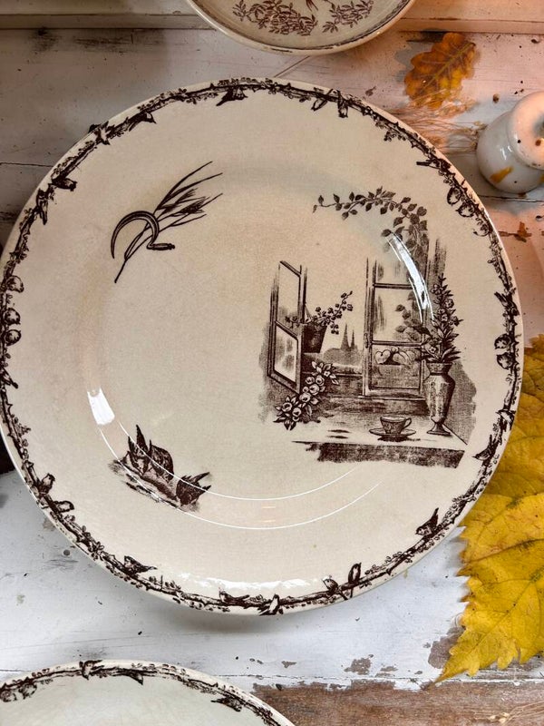 Décor brun sépia à motifs champêtres et scènes de vie villageoise, entouré d’une fine frise d’oiseaux.