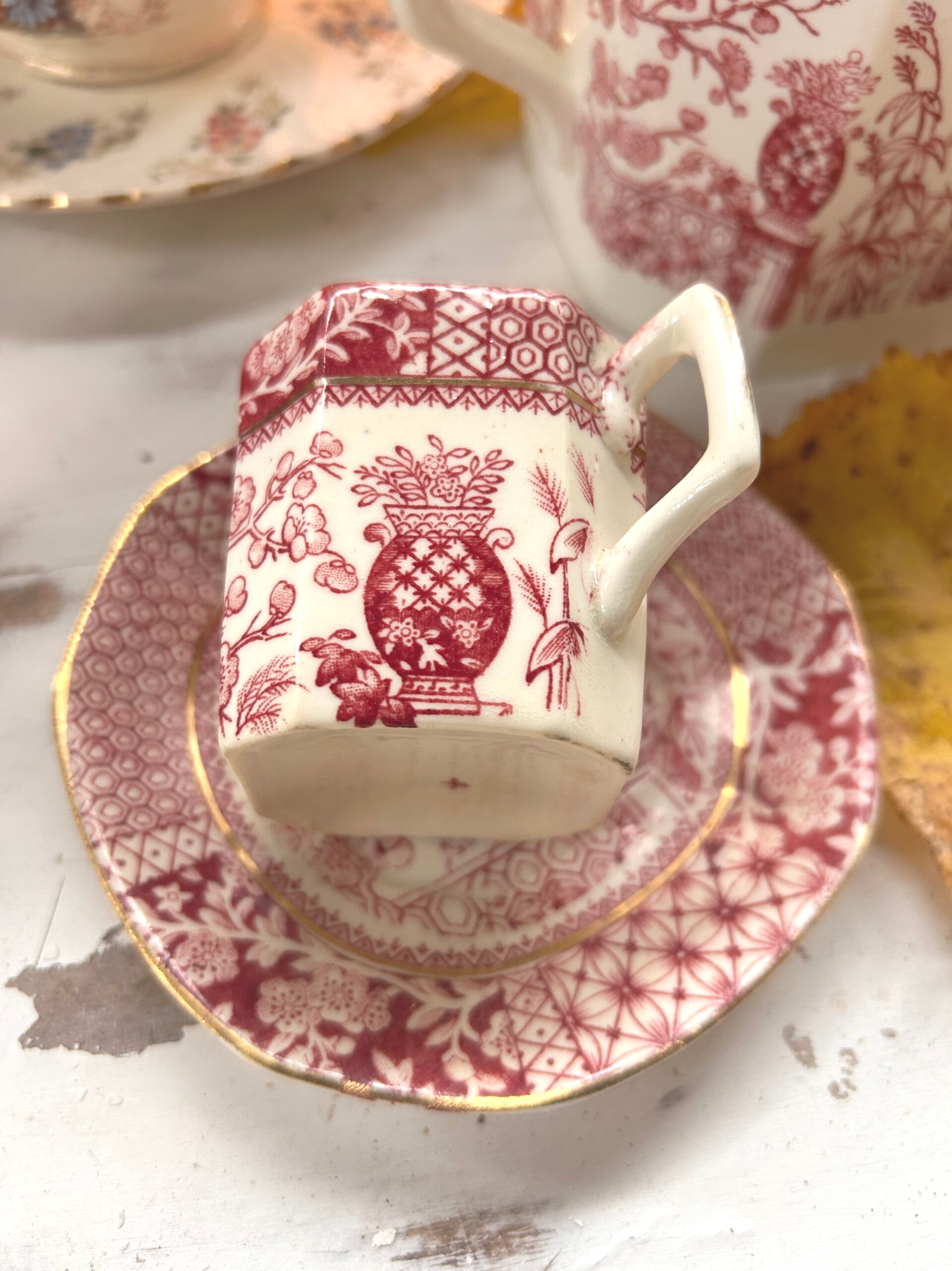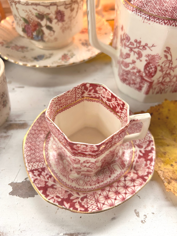 Tasse café en faïence ancienne – décor floral bordeaux – style victorien