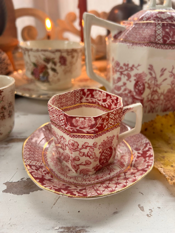 Ravissante tasse à facettes en faïence fine avec sa soucoupe assortie, décorée d’un motif floral rouge bordeaux à inspiration orientale.
