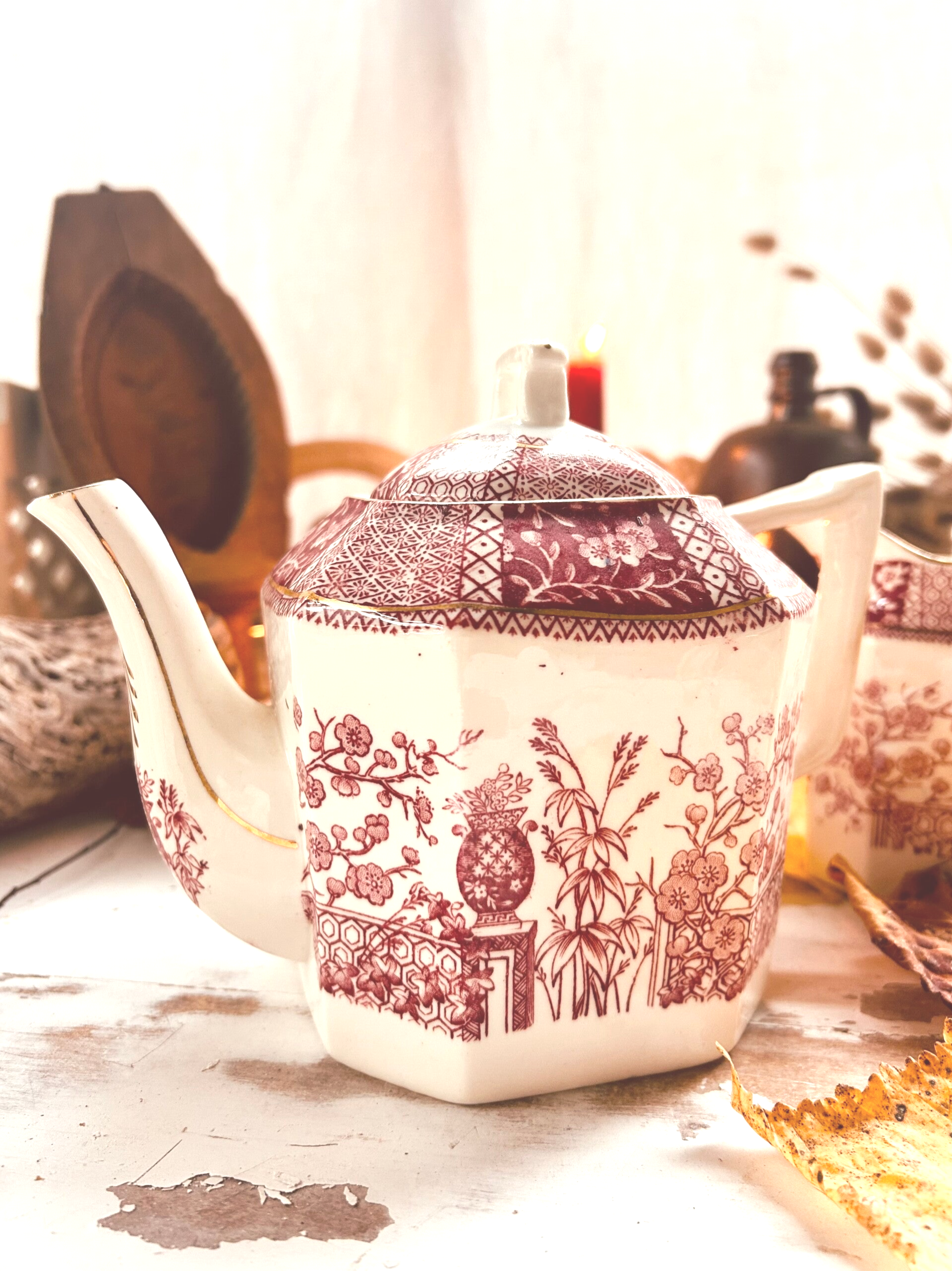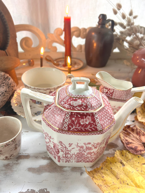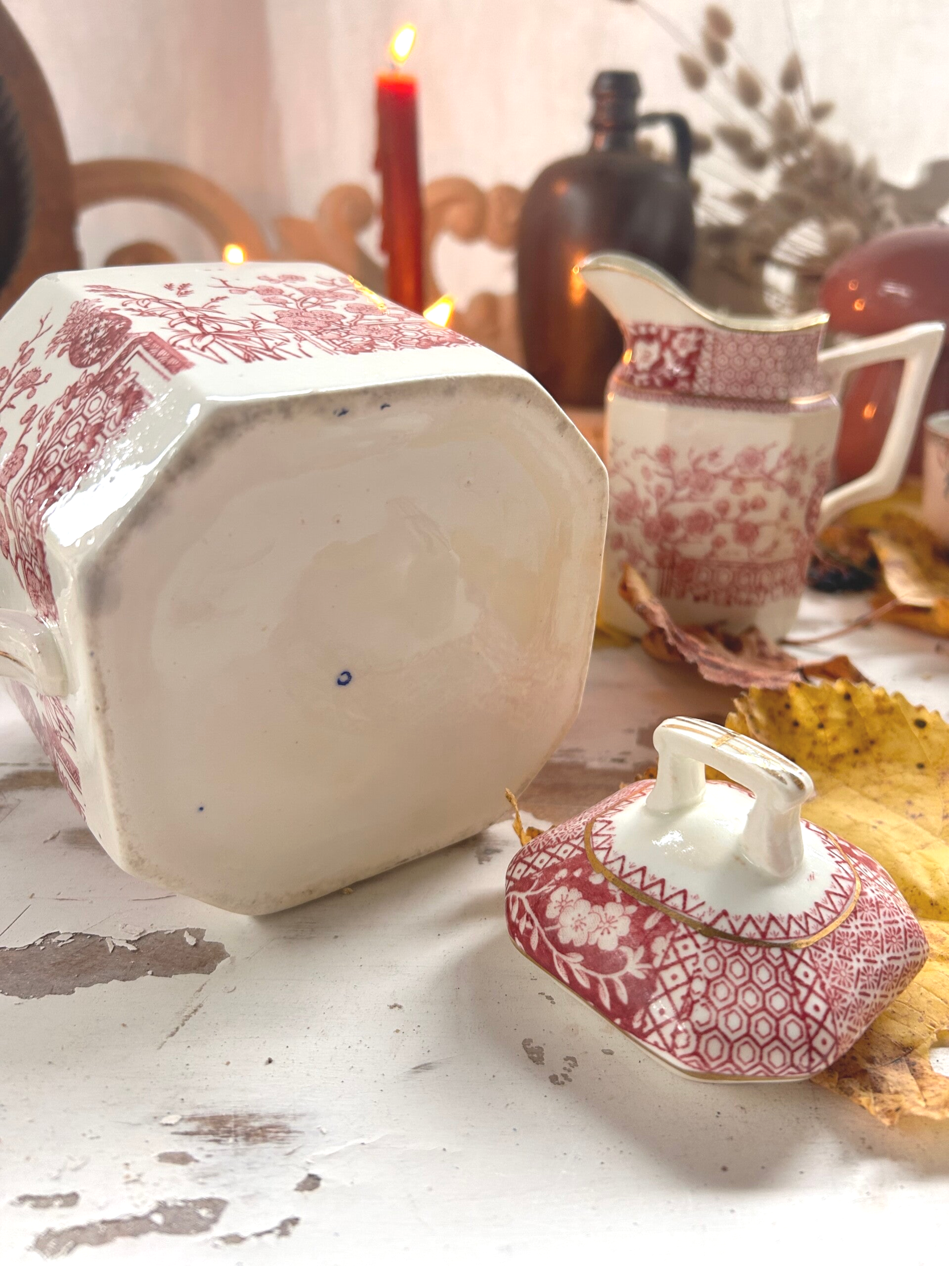 Théière ancienne en faïence – décor floral rouge bordeaux – style victorien