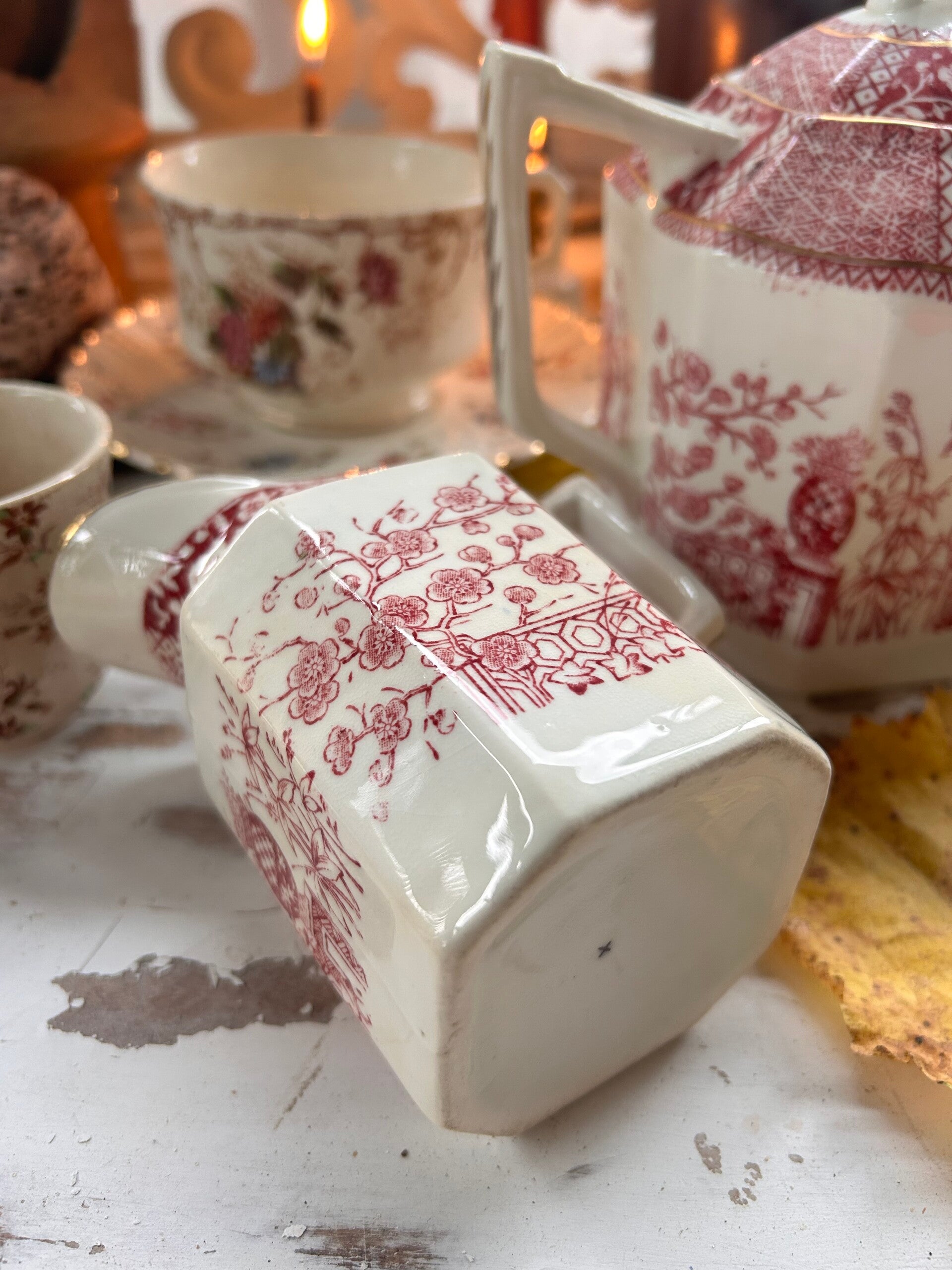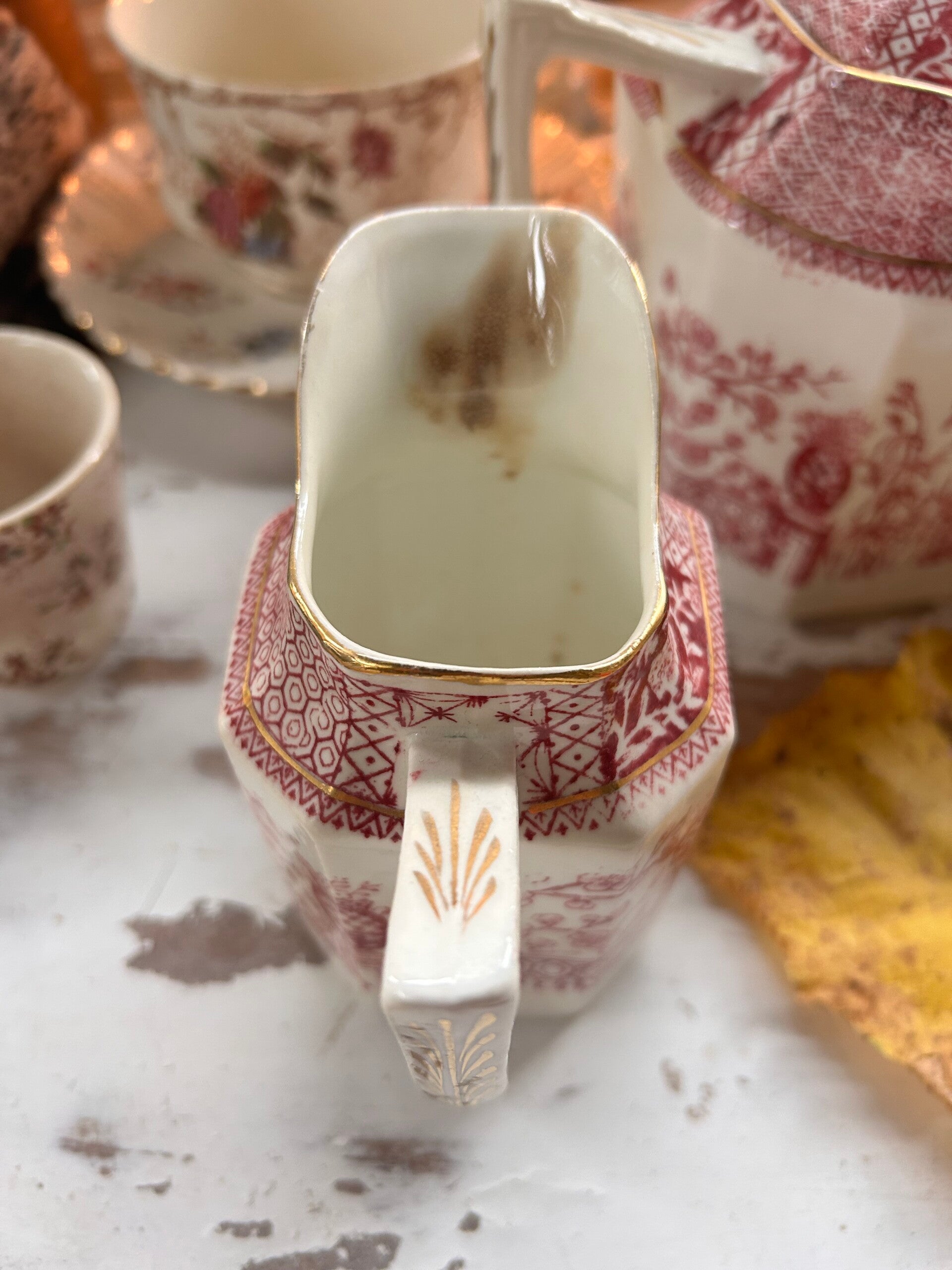 Pot à lait en faïence fine à la forme angulaire élégante, décoré d’un magnifique motif transferware rouge bordeaux mêlant vases fleuris et frises géométriques.