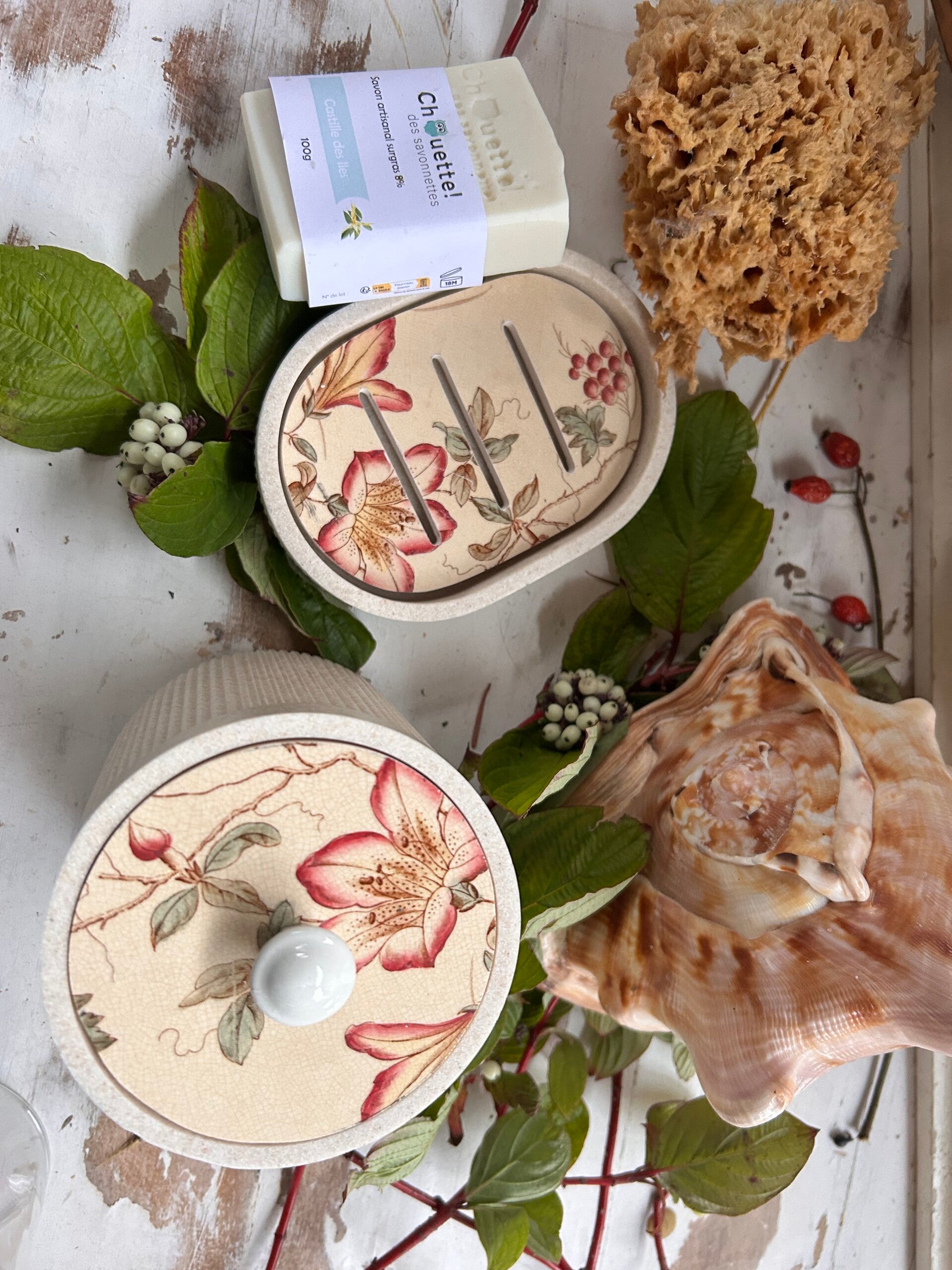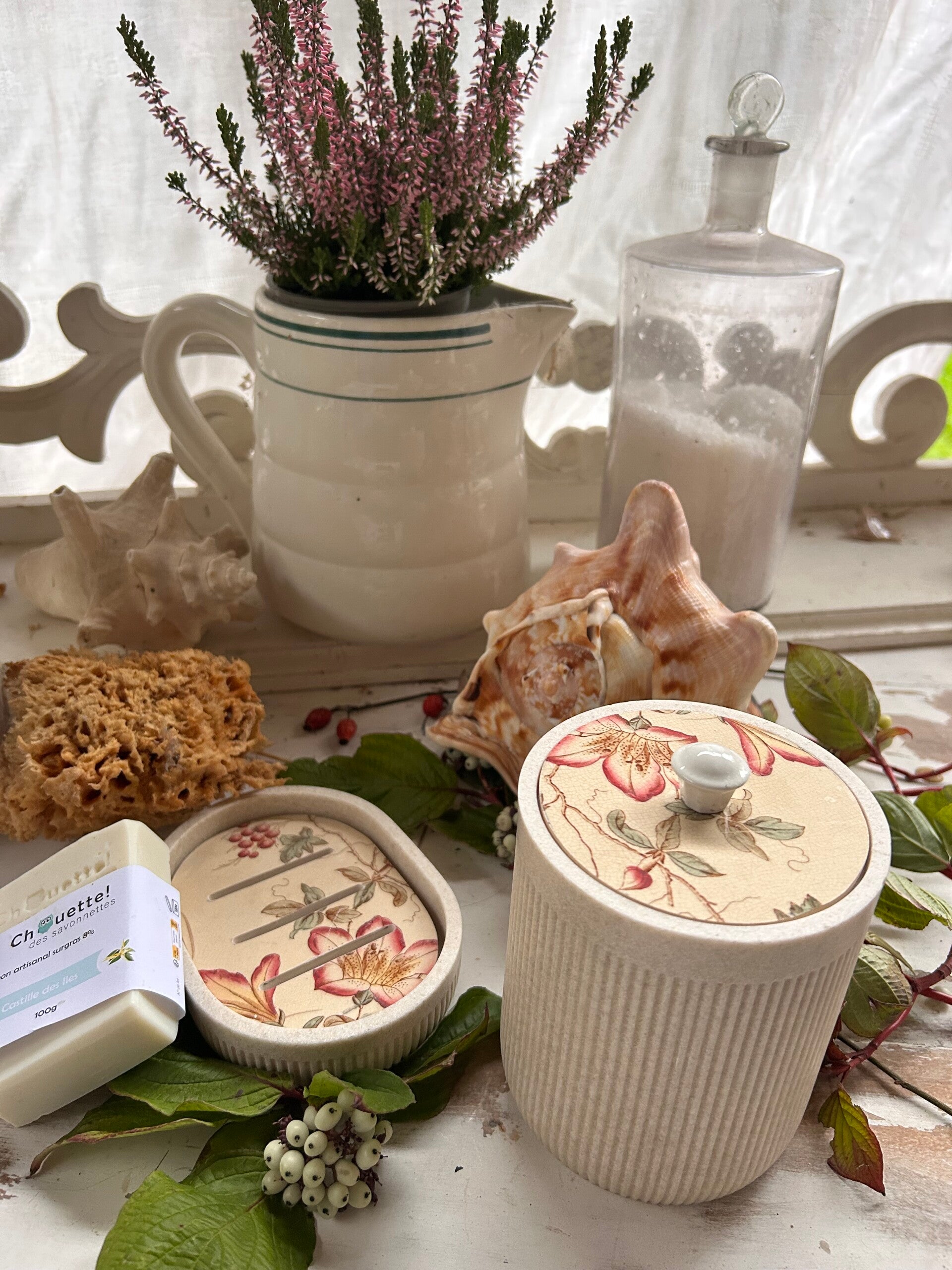 Cet ensemble délicat évoque la quiétude d’une salle de bain ancienne, baignée de lumière naturelle et parfumée de savon artisanal.