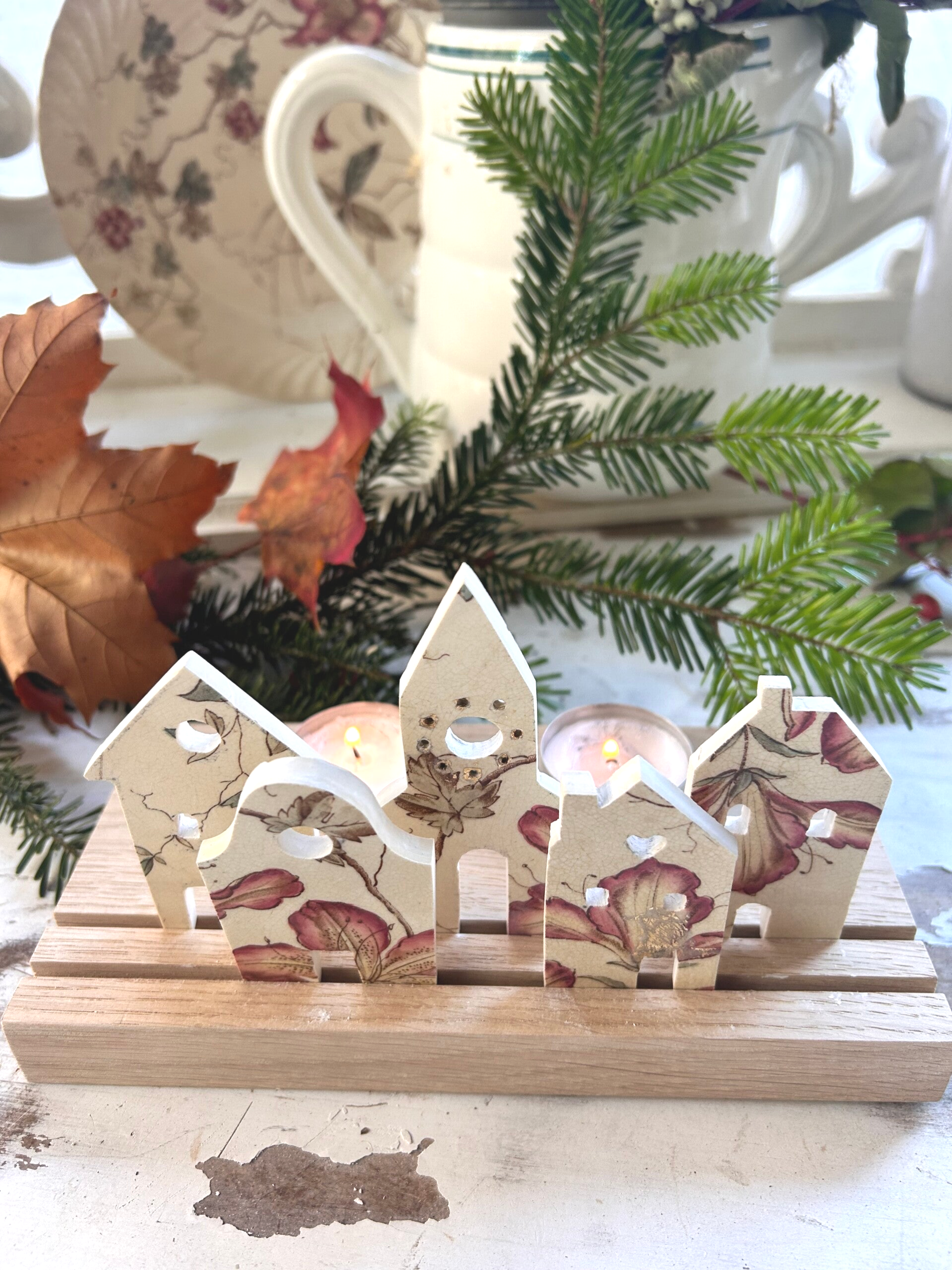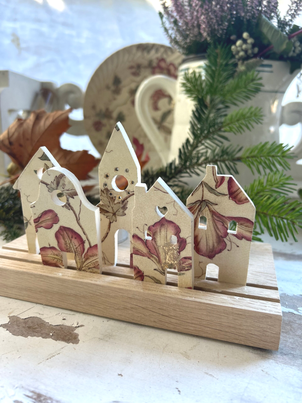 Les motifs floraux caractéristiques de ce modèle, dans leurs tons rouges profonds et verts doux, viennent habiller avec délicatesse les quatre petites maisons et leur église centrale, créant une scène empreinte de poésie et de nostalgie.