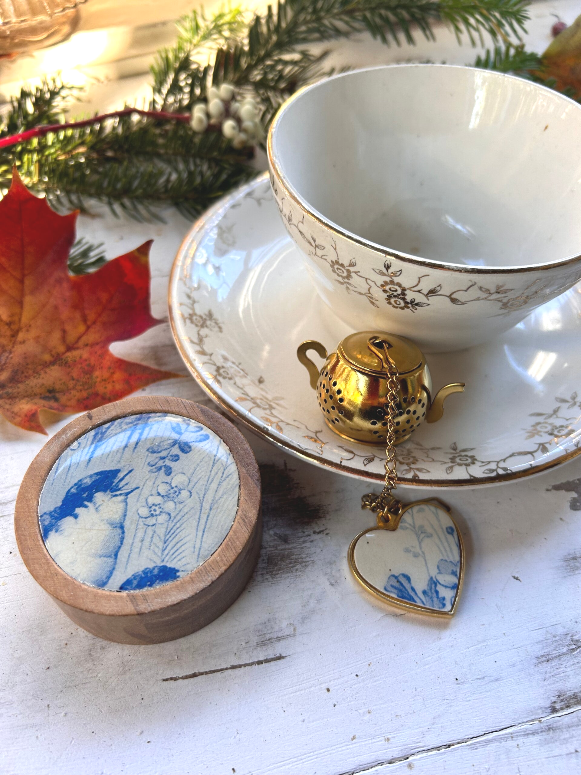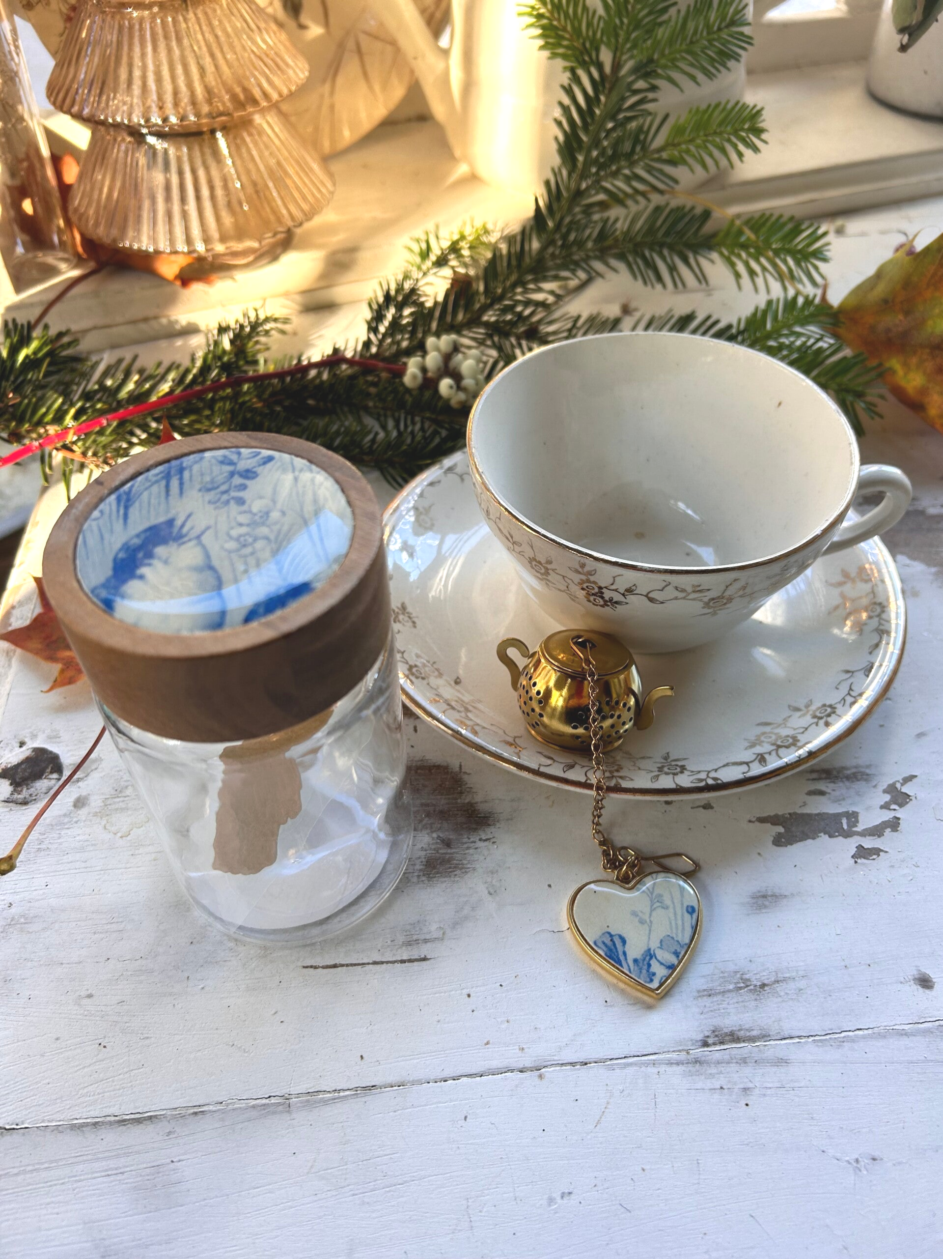 Un infuseur à thé doré, orné d’un cœur incrusté d’un fragment d’assiette ancienne Jules Vieillard Bordeaux, modèle Oiseau