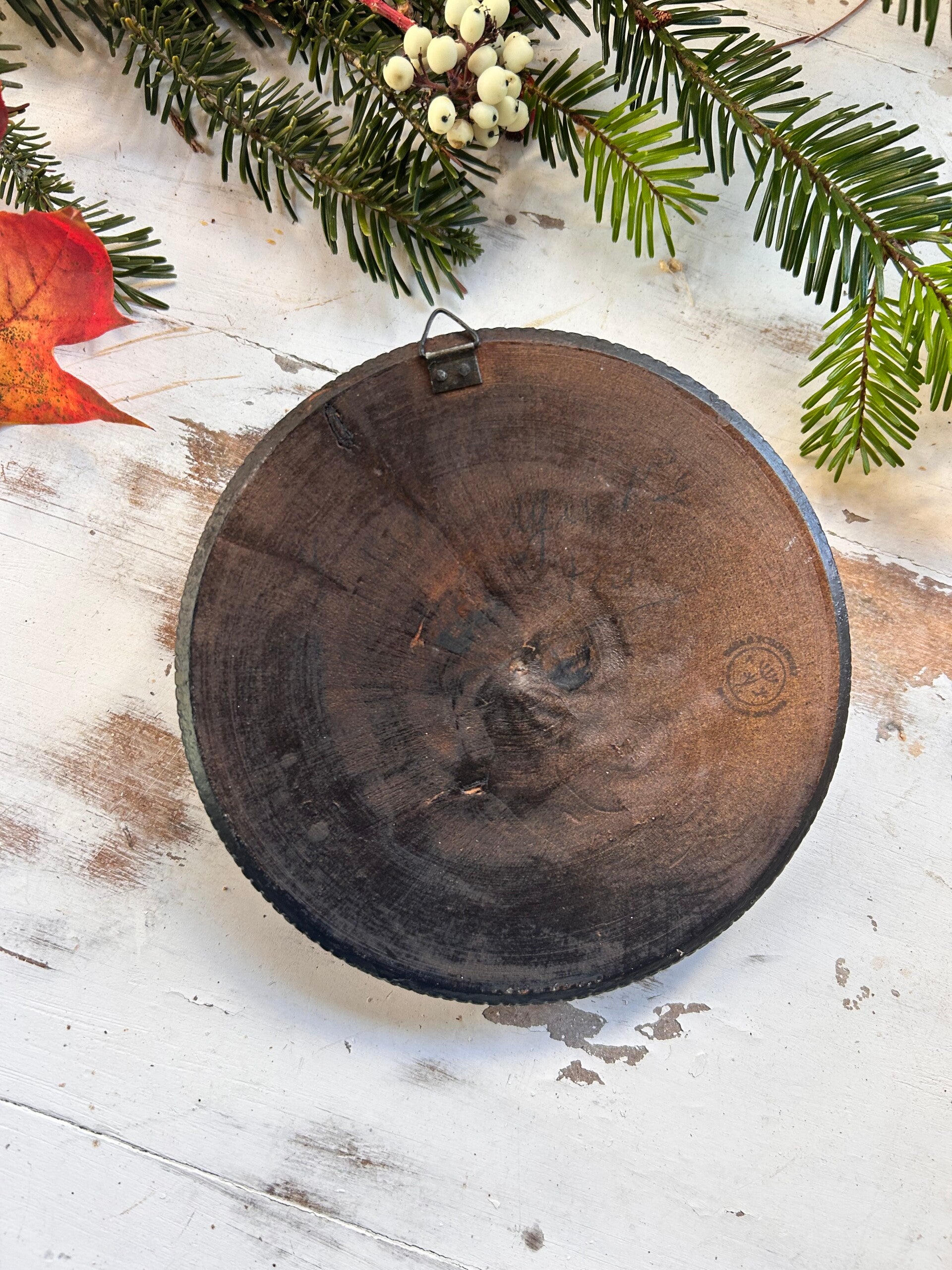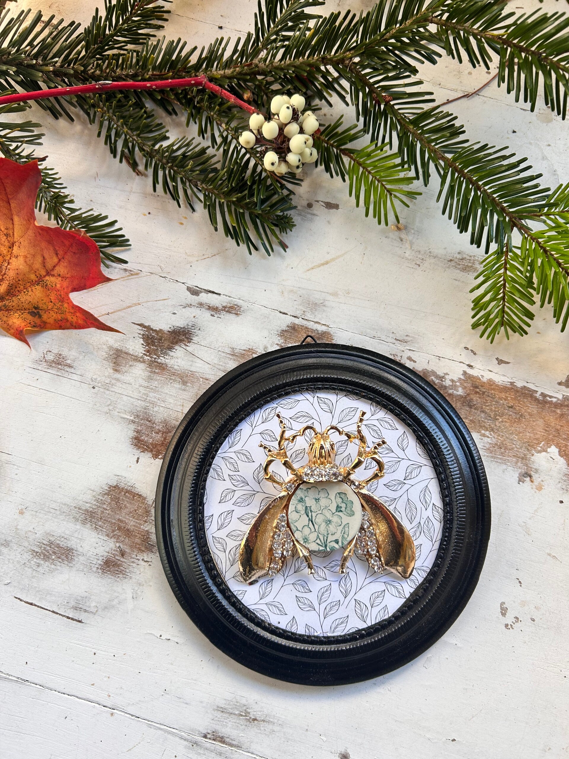 Ce cadre rond en bois sculpté dans la masse, entièrement repeint d’un noir mat, accueille un insecte doré en plein vol, dont le centre est taillé dans une assiette Sarreguemines modèles géranium .