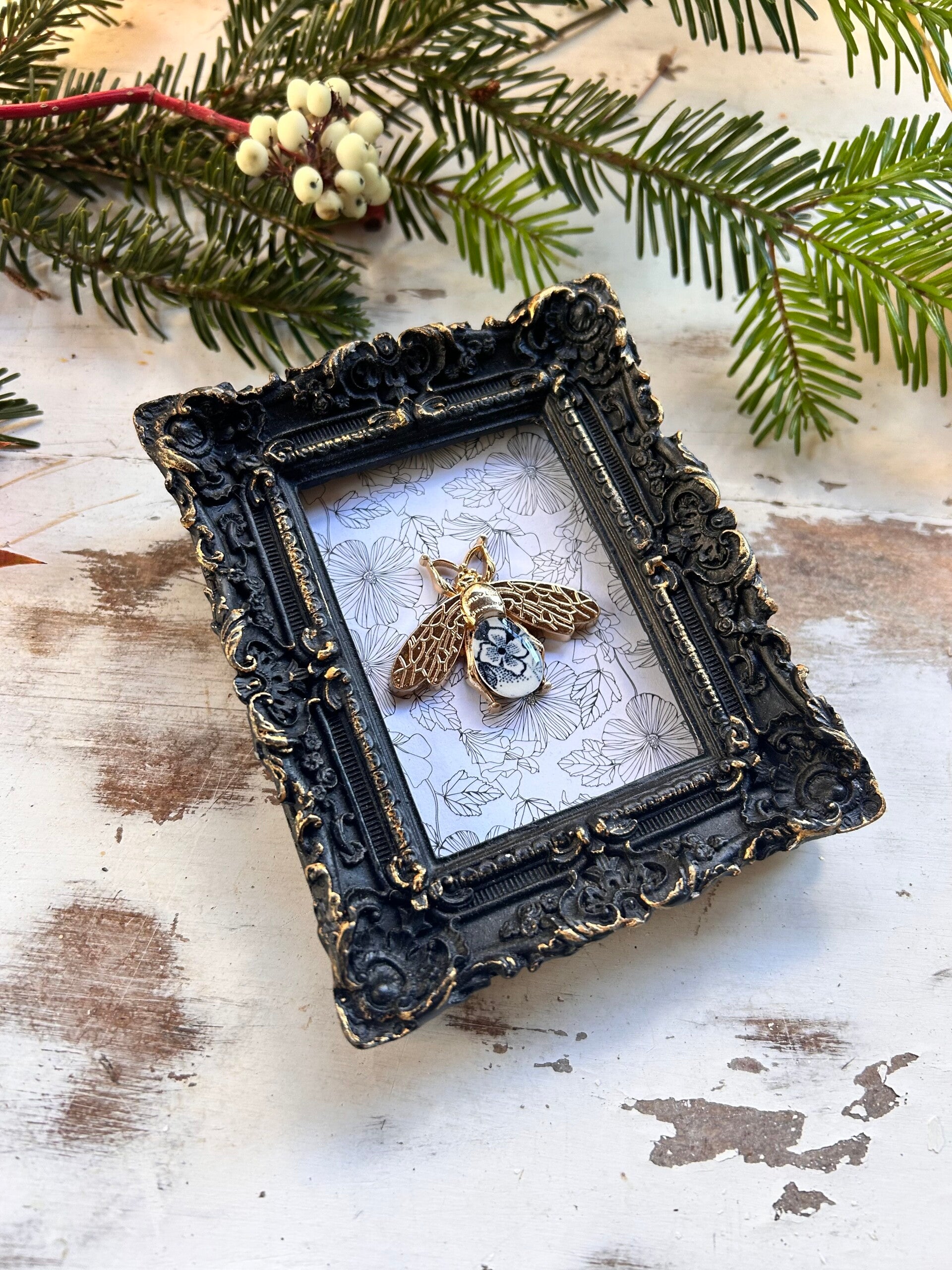 En son centre, une abeille dorée surmontée d'un fragment d’assiette ancienne Marie Louise de la manufacture Saint-Amand — un éclat de faïence devenu bijou de nature.