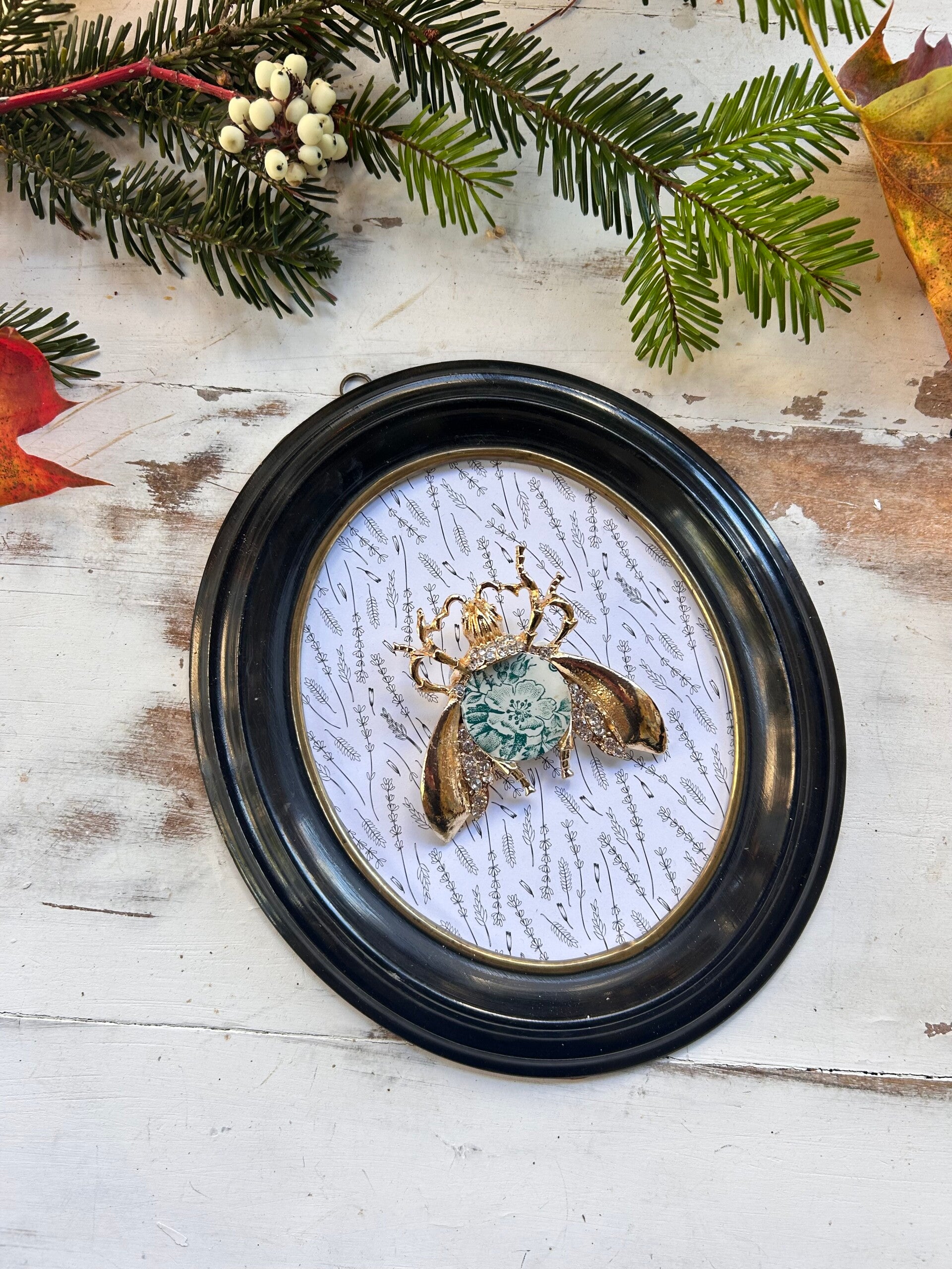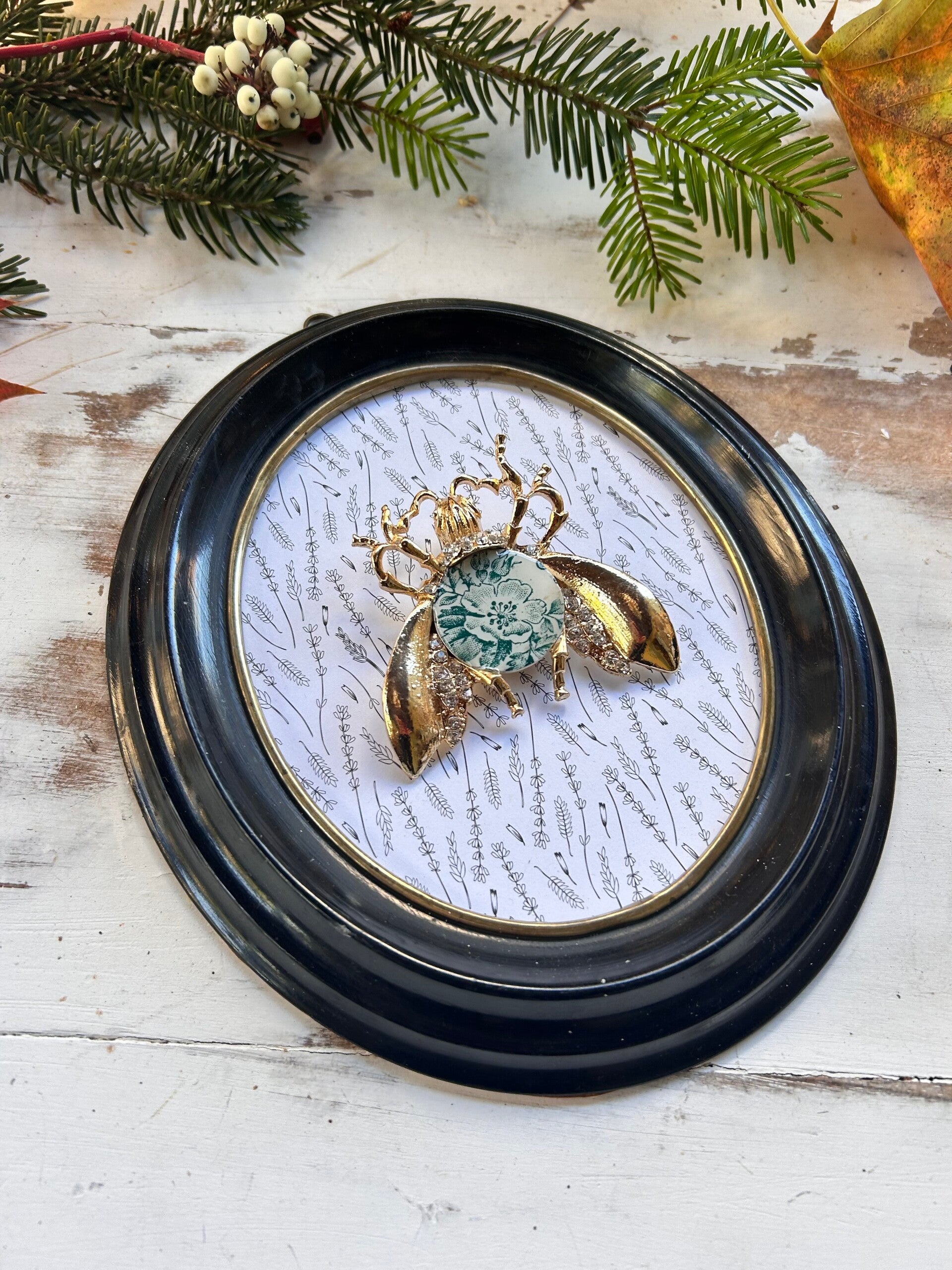 Ancien cadre Napoléon III en bois noir et laiton doré, abritant un élégant insecte doré orné en son centre d’un fragment de faïence ancienne au motif floral vert tendre Saint amant modèle Guadeloupe