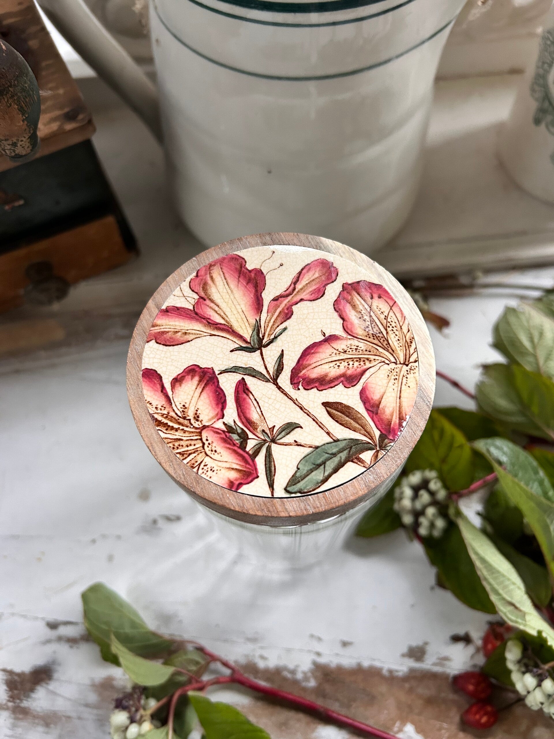 Bocal en verre cannelé orné d’un couvercle en bois, dans lequel a été incrusté un fragment d’assiette ancienne Azalia de la manufacture anglaise W.A.A & Co.