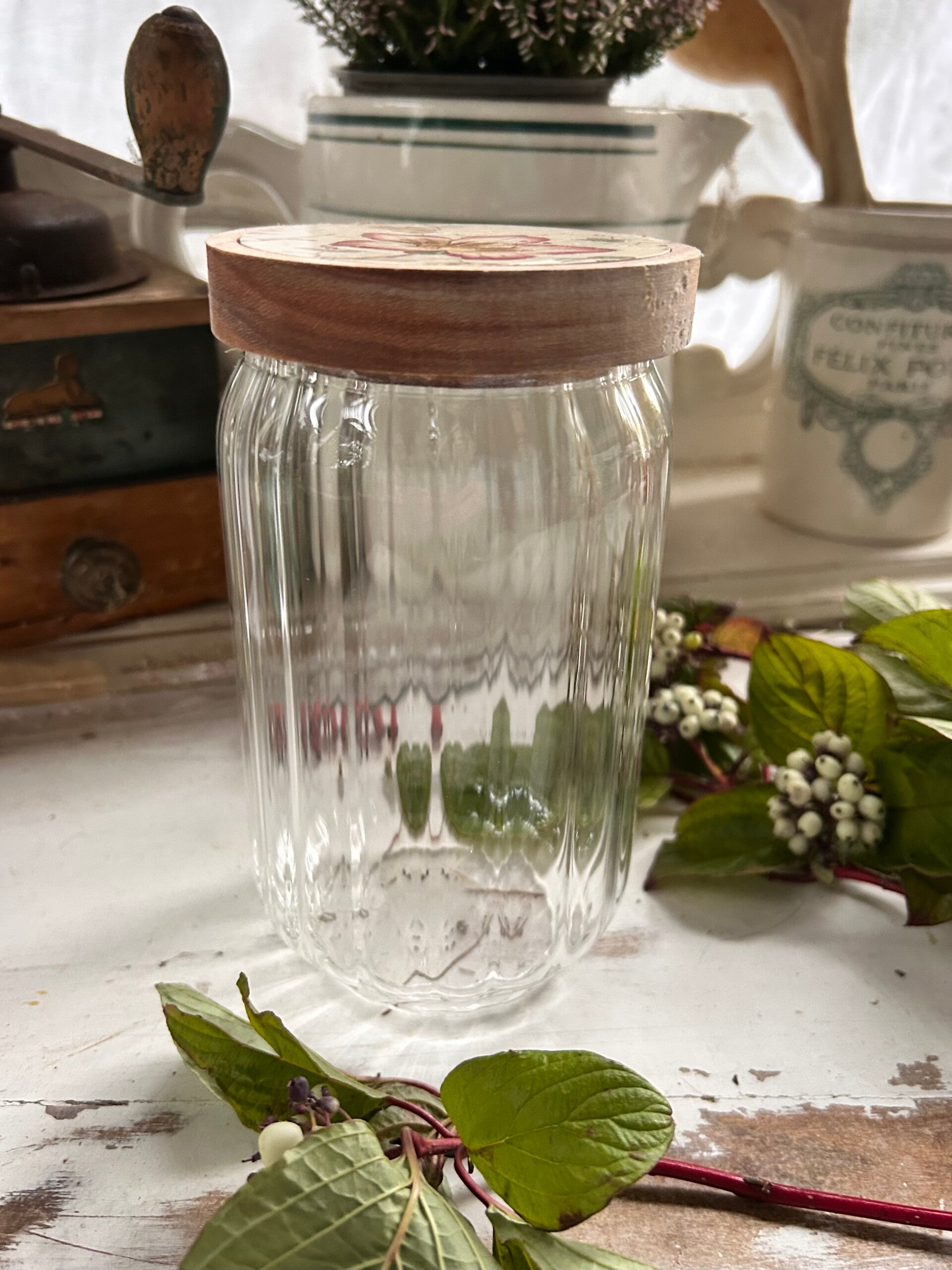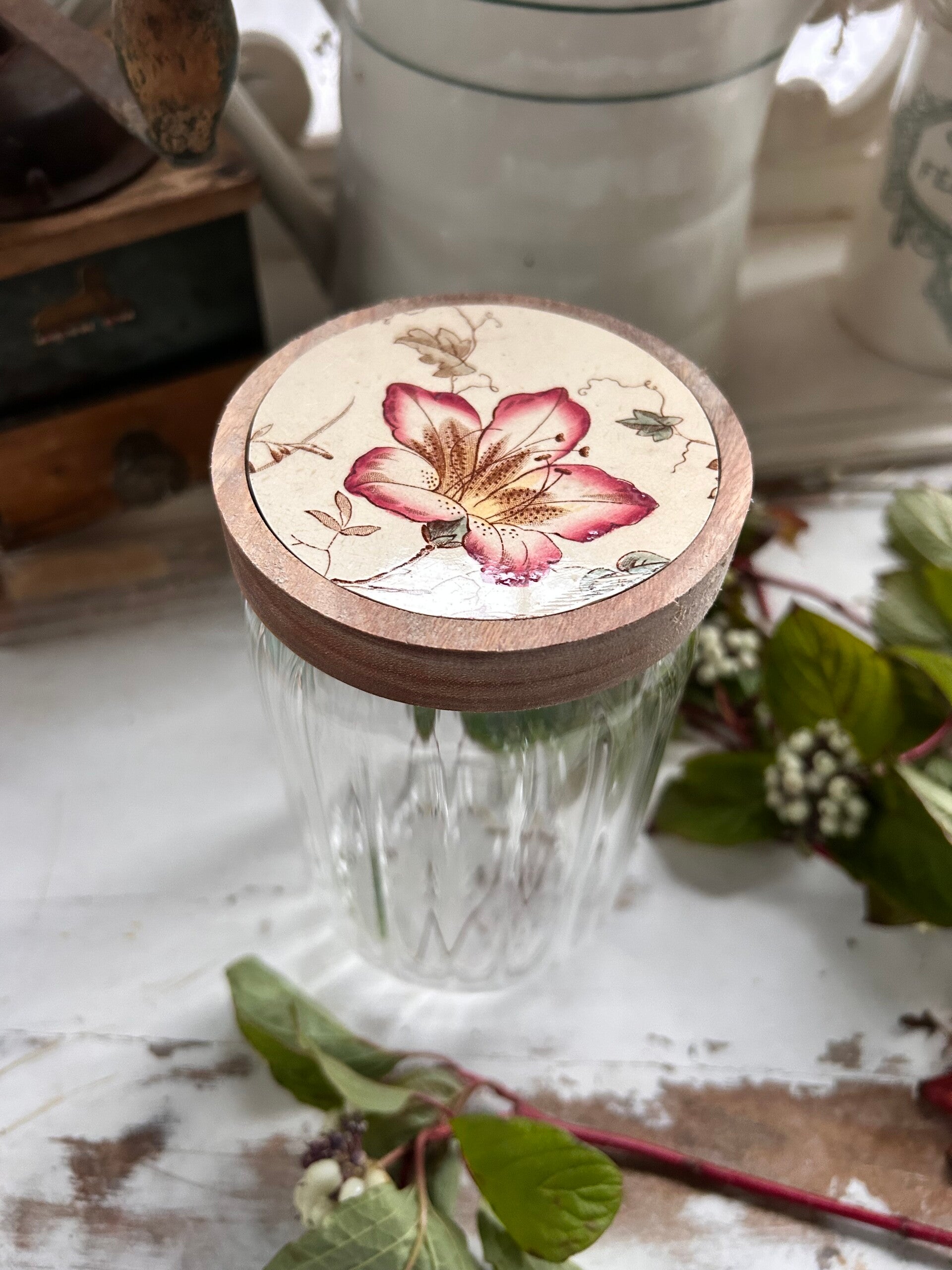 Bocal en verre cannelé et couvercle bois orné d’un fragment d’assiette ancienne Azalia – W.A.A & Co, délicatement fleuri dans des tons doux.