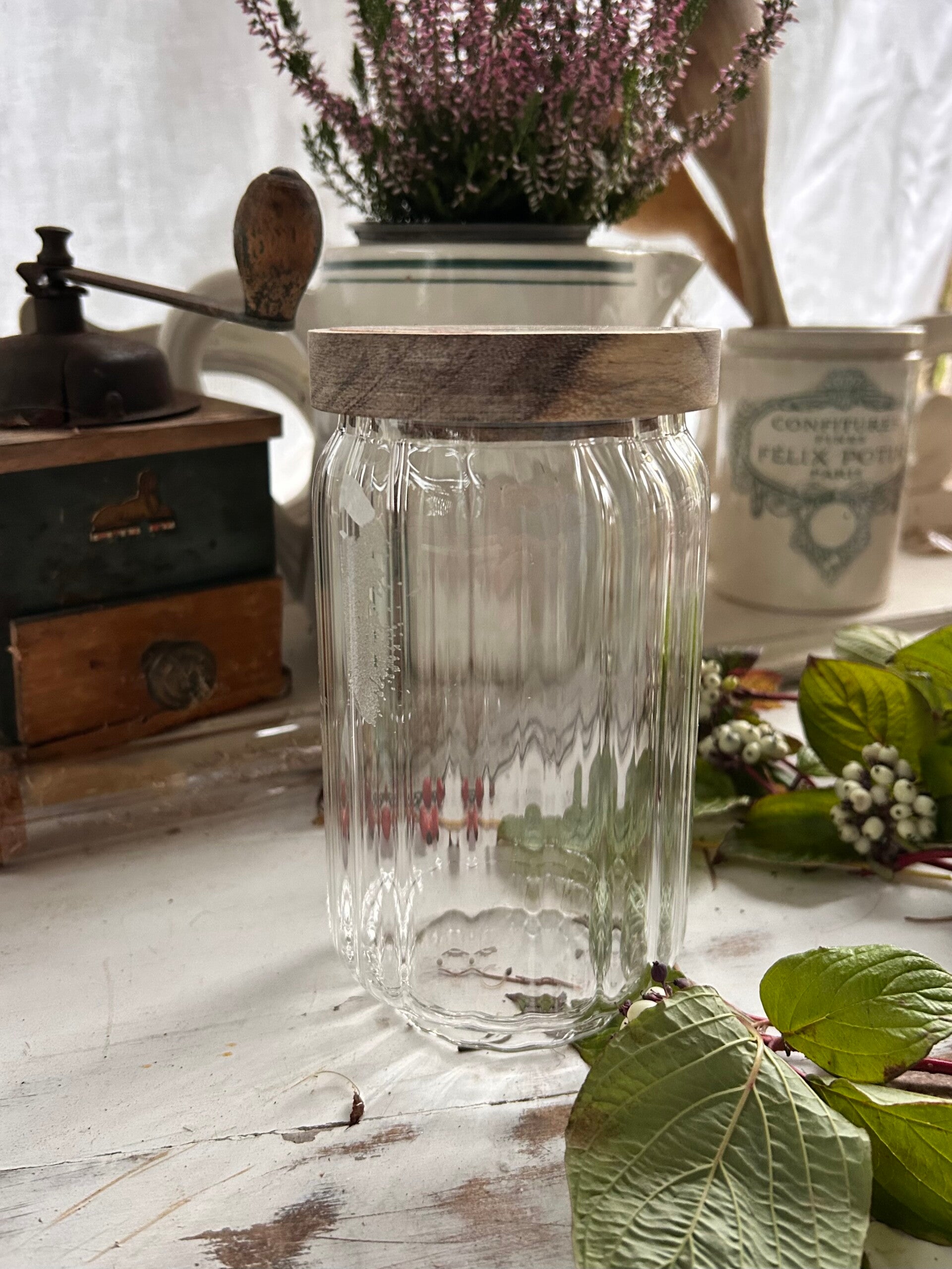 Entre transparence et douceur, ce bocal en verre cannelé s’orne d’un couvercle bois incrusté d’un fragment d’assiette ancienne Azalia – W.A.A & Co.
