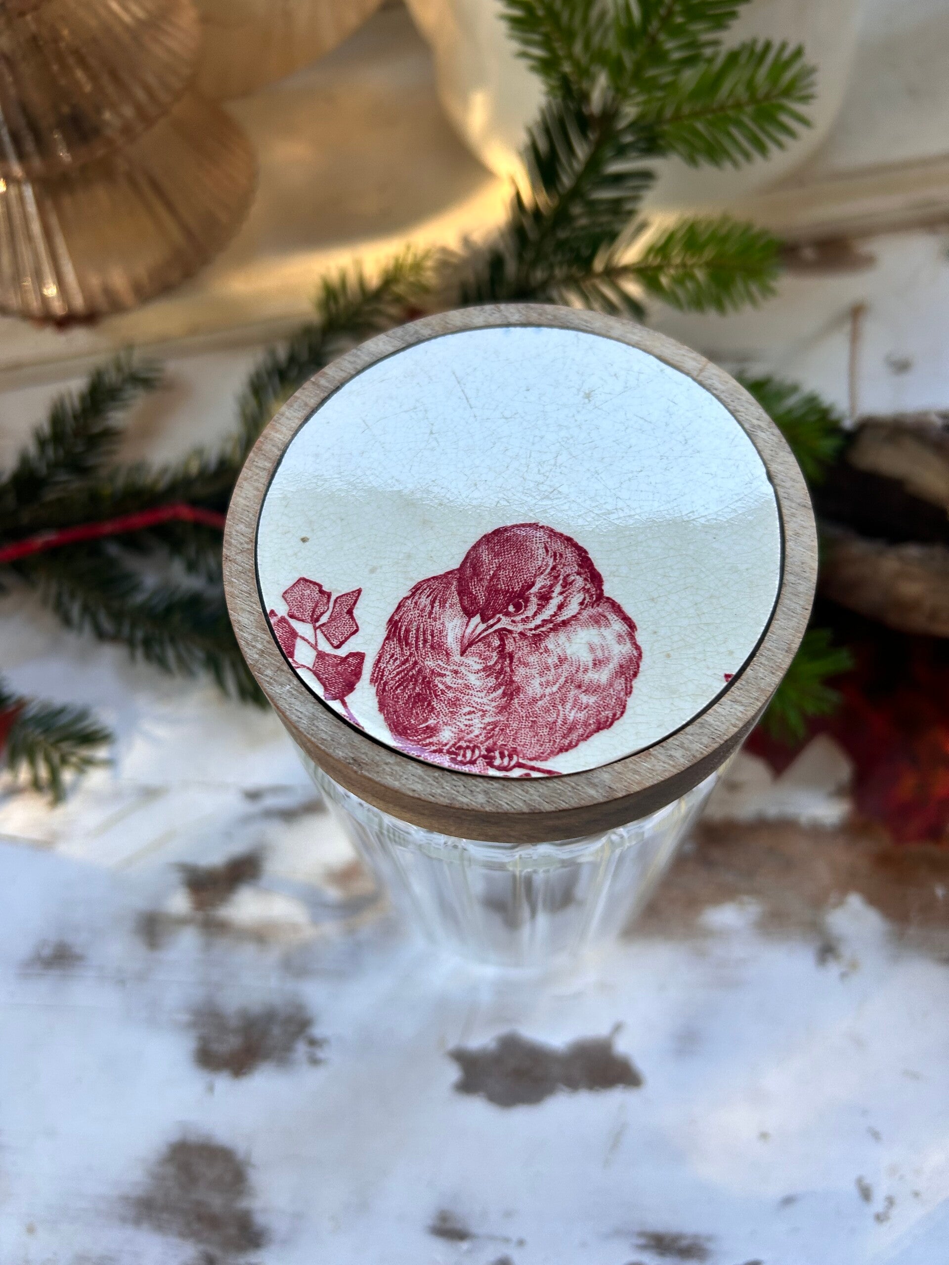 Son bouchon en bois a été orné d’un fragment d’assiette ancienne Longwy au décor Oiseaux, dans de doux tons de rouge et de crème. Chaque pièce est unique, façonnée à la main, et raconte à sa manière l’histoire d’une vaisselle oubliée.