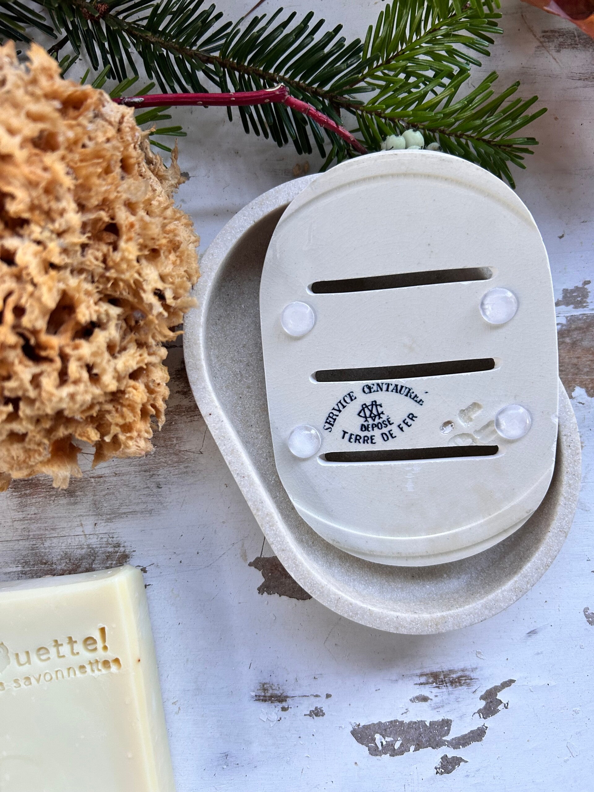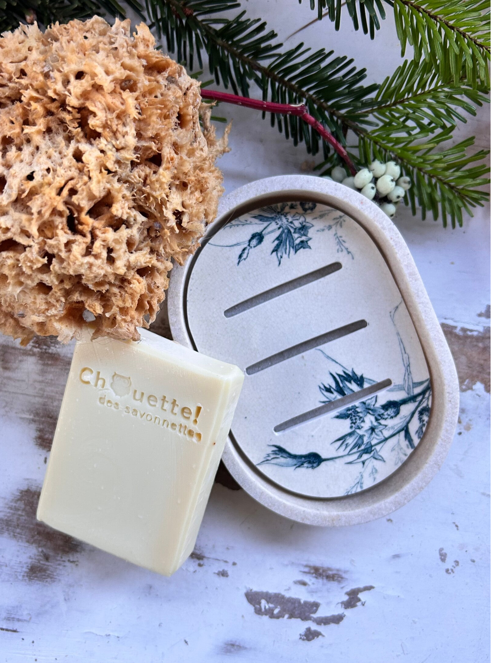 Porte savon au style délicieusement rétro. Sa base effet pierre beige met en valeur un délicat fragment d'assiette terre de fer Creil et Montereau modéle Centaurée , aux teintes bleues et motifs floraux champêtre