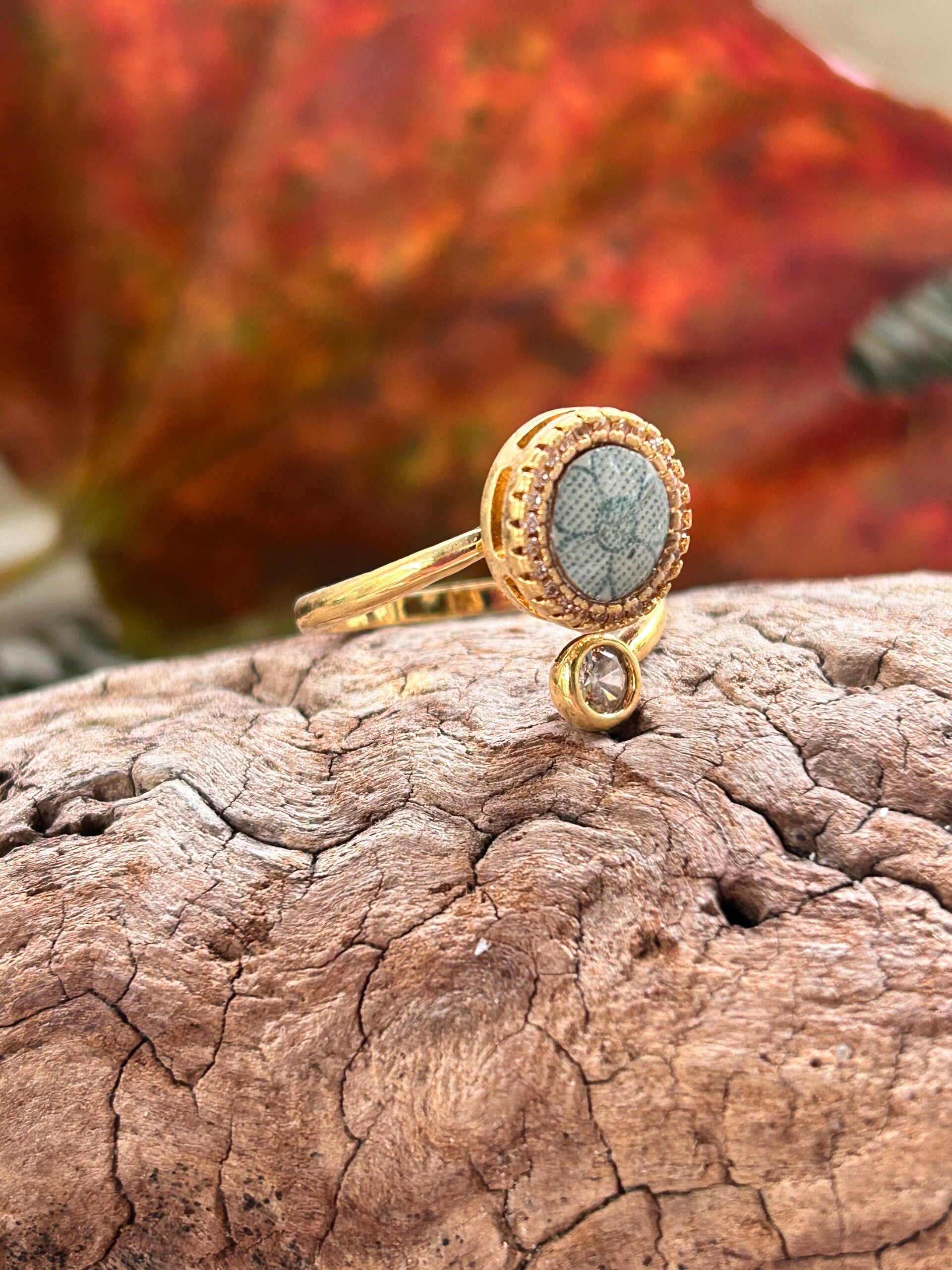 Bague ajustable ornée d’un cabochon en faïence ancienne terre de fer, HB & Co, modéle Henriette,mis en valeur par un cercle de strass scintillants.