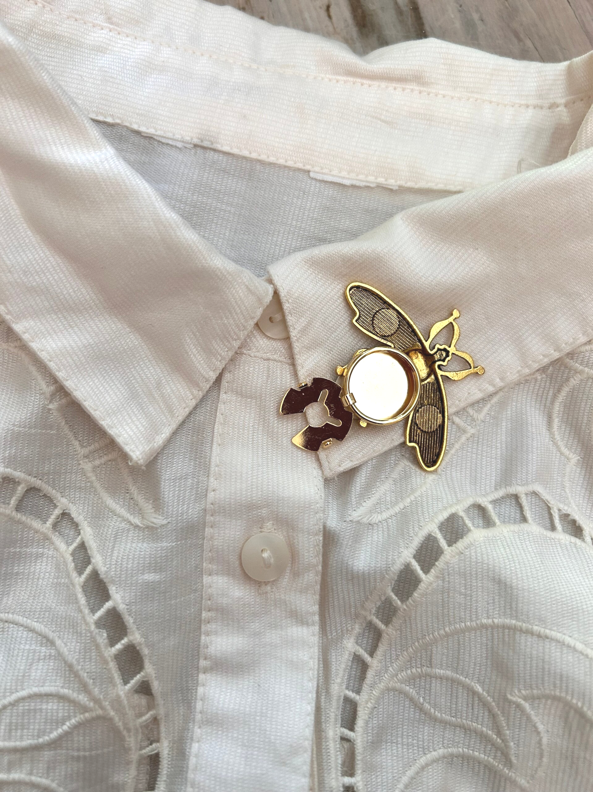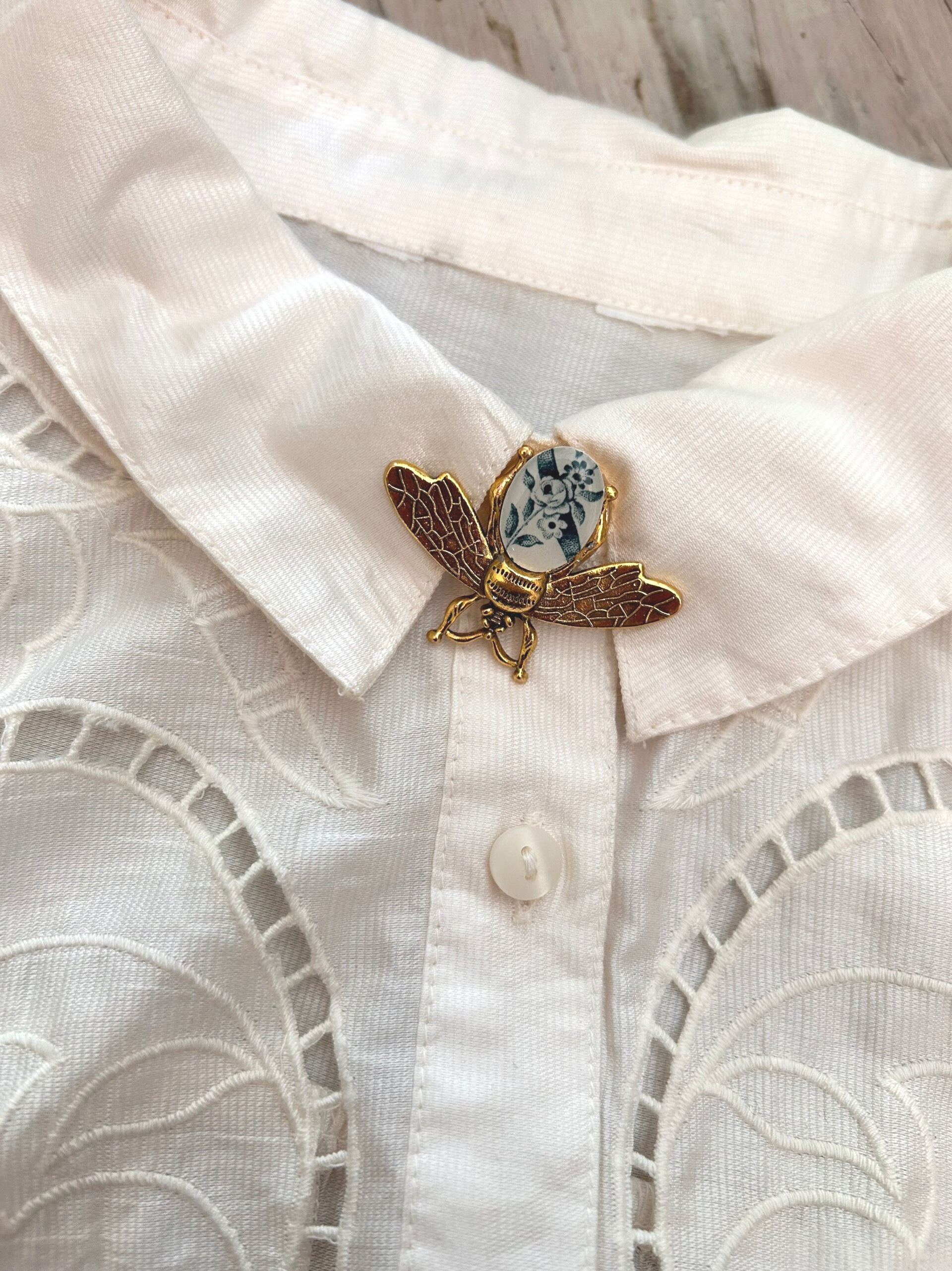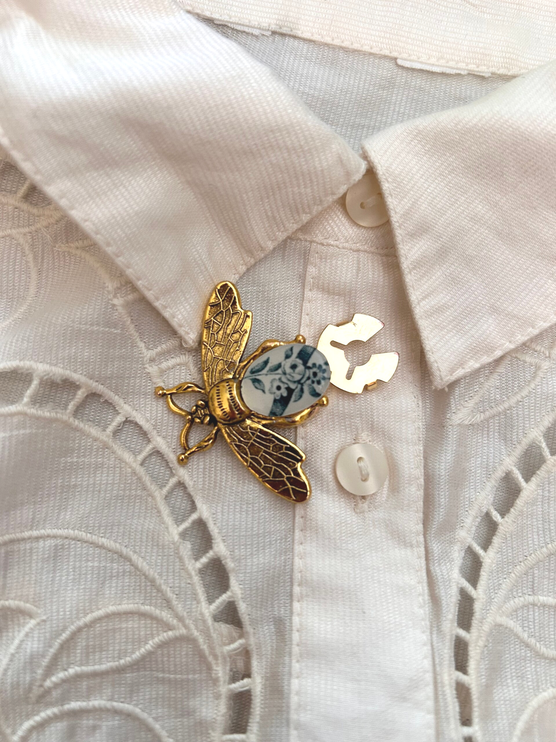 Cette abeille dorée, à la silhouette délicate, abrite en son cœur un fragment d’ancienne terre de fer, au décor fleuri patiné par le temps.