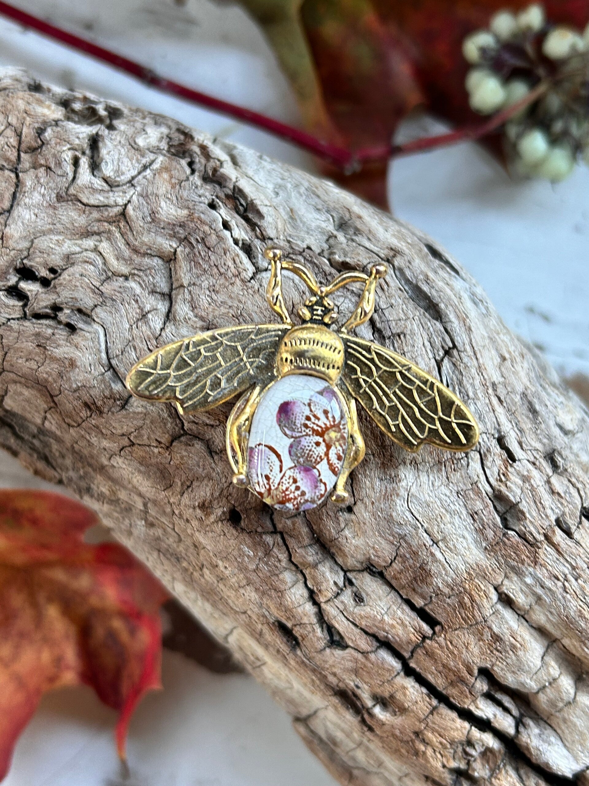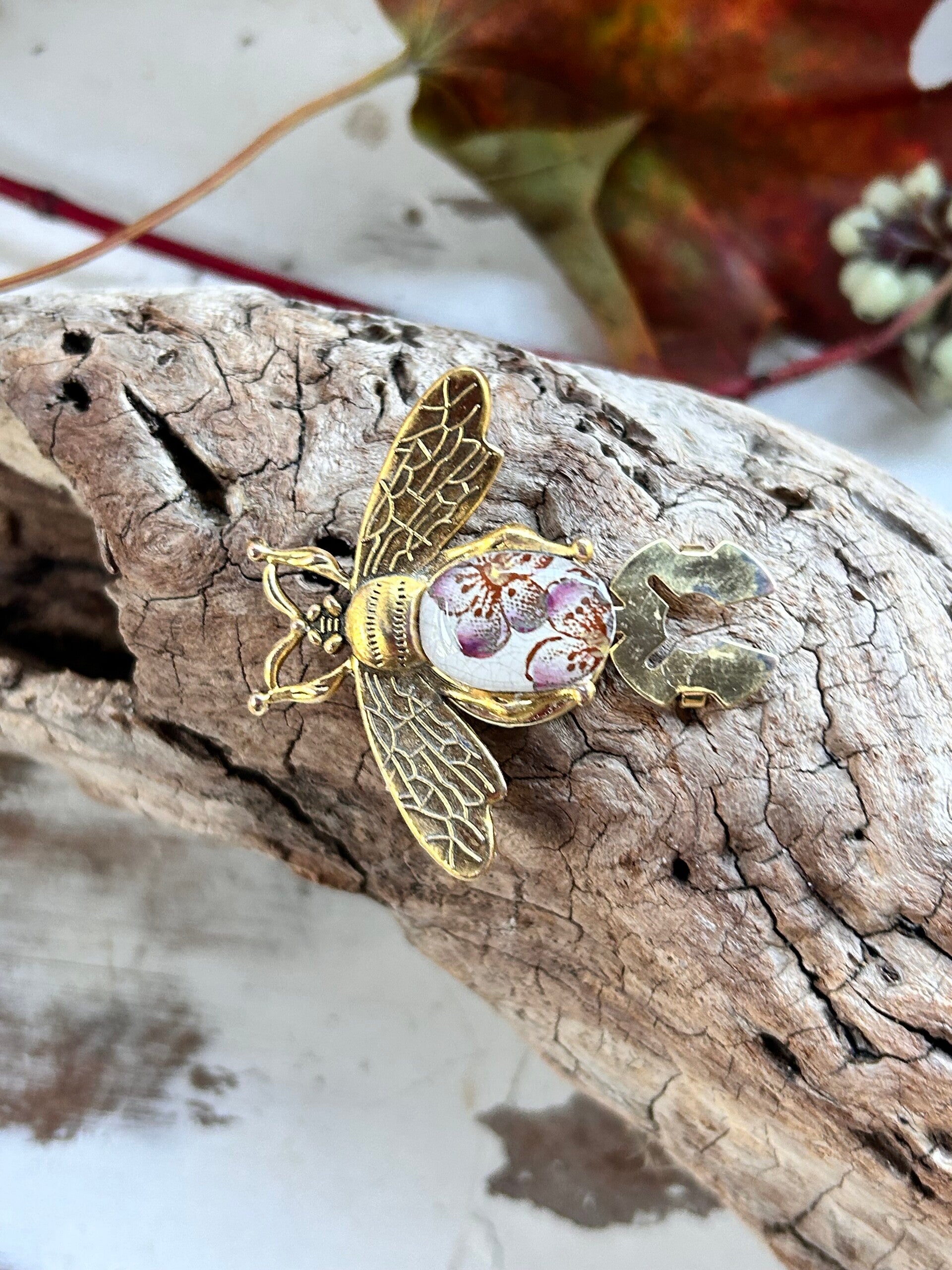 Cette petite abeille dorée, délicatement travaillée, dissimule un fragment d’histoire : son corps est orné d’un éclat d’assiette Carmen polychrome, issue de la manufacture Sarreguemines.