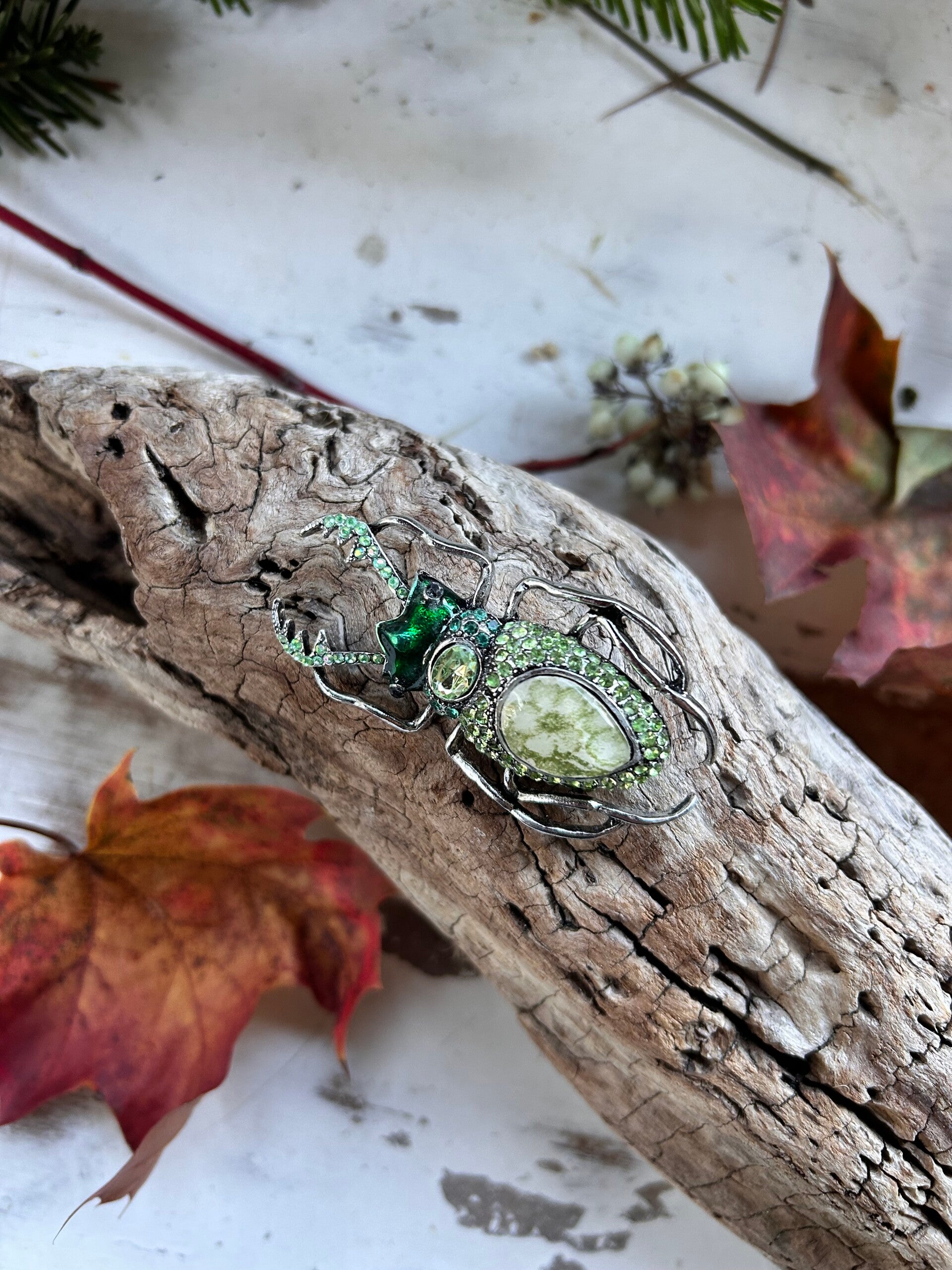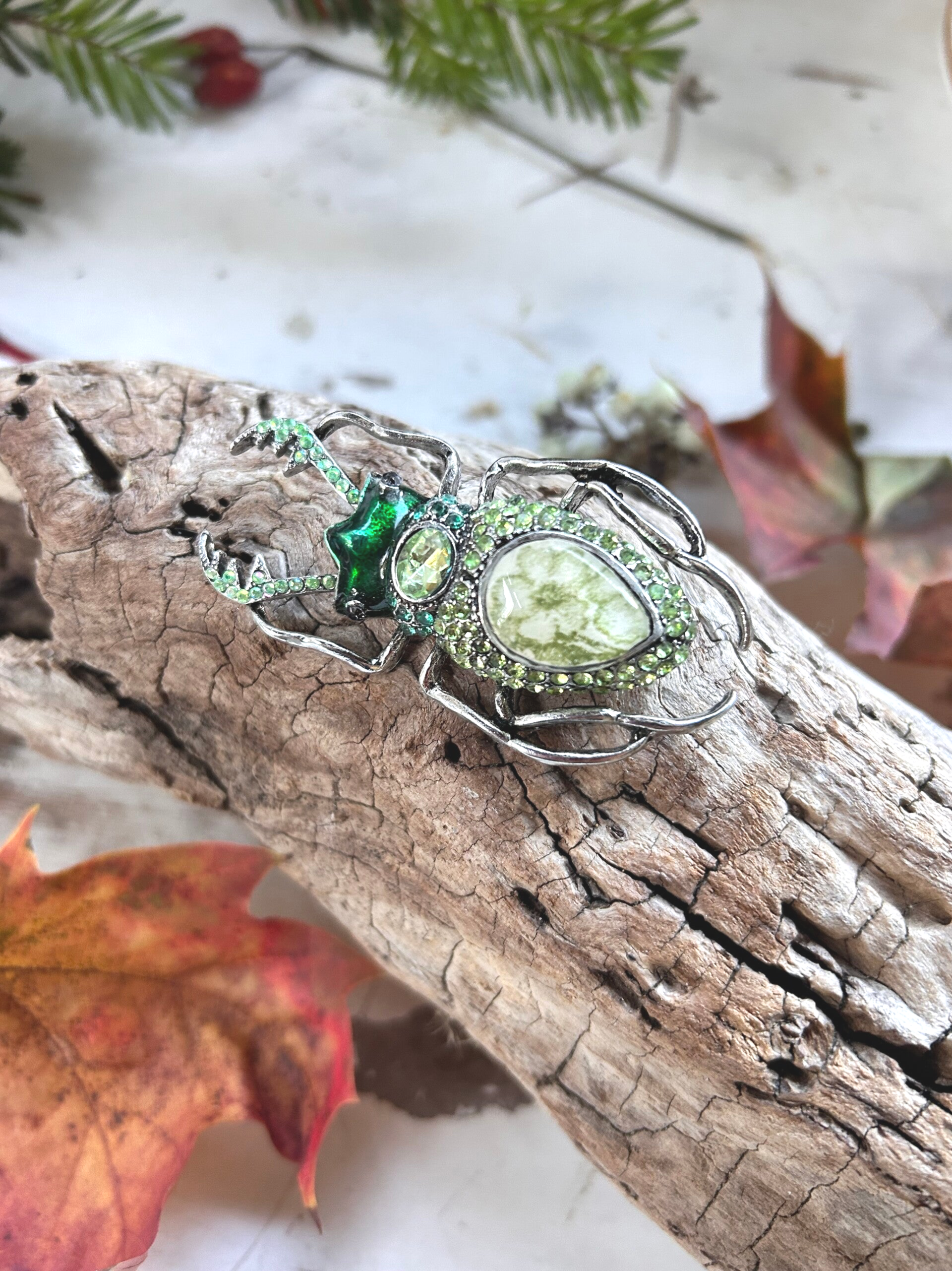 Ce scarabée vibrant aux reflets vert émeraude évoque la profondeur des forêts et la vitalité de la nature.