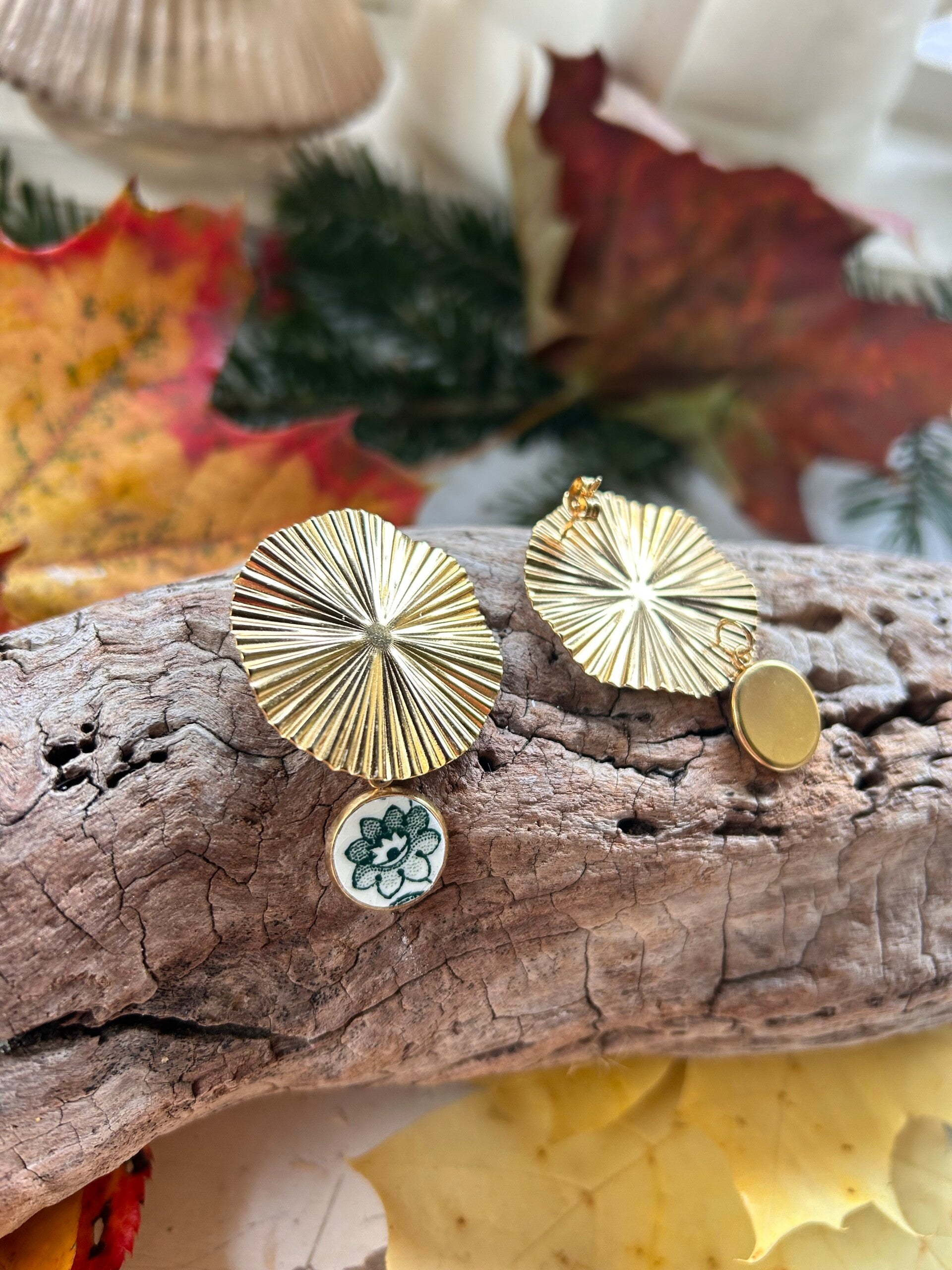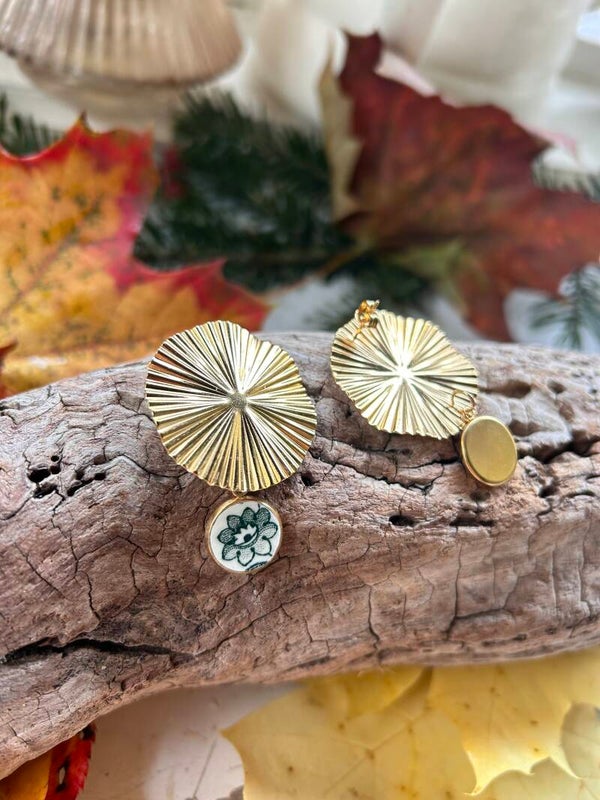 Élégantes et solaires, ces boucles d’oreilles mettent à l’honneur l’upcycling de faïence ancienne.