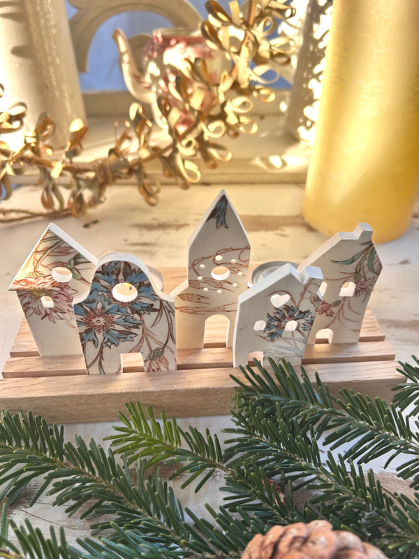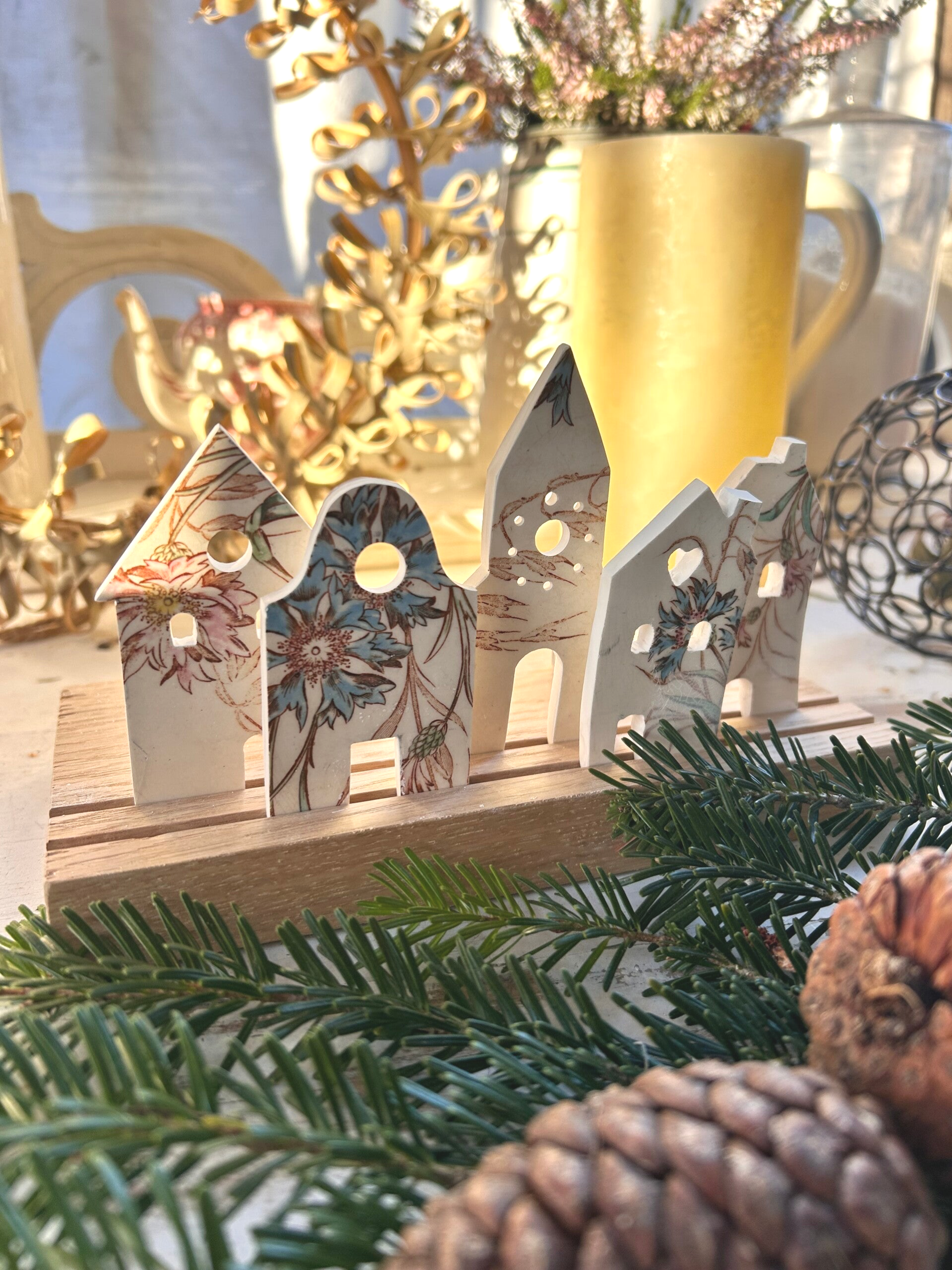 Les motifs floraux caractéristiques de ce modèle, dans leurs tons roses et de bleus, viennent habiller avec délicatesse les quatre petites maisons et leur église centrale, créant une scène empreinte de poésie et de nostalgie.