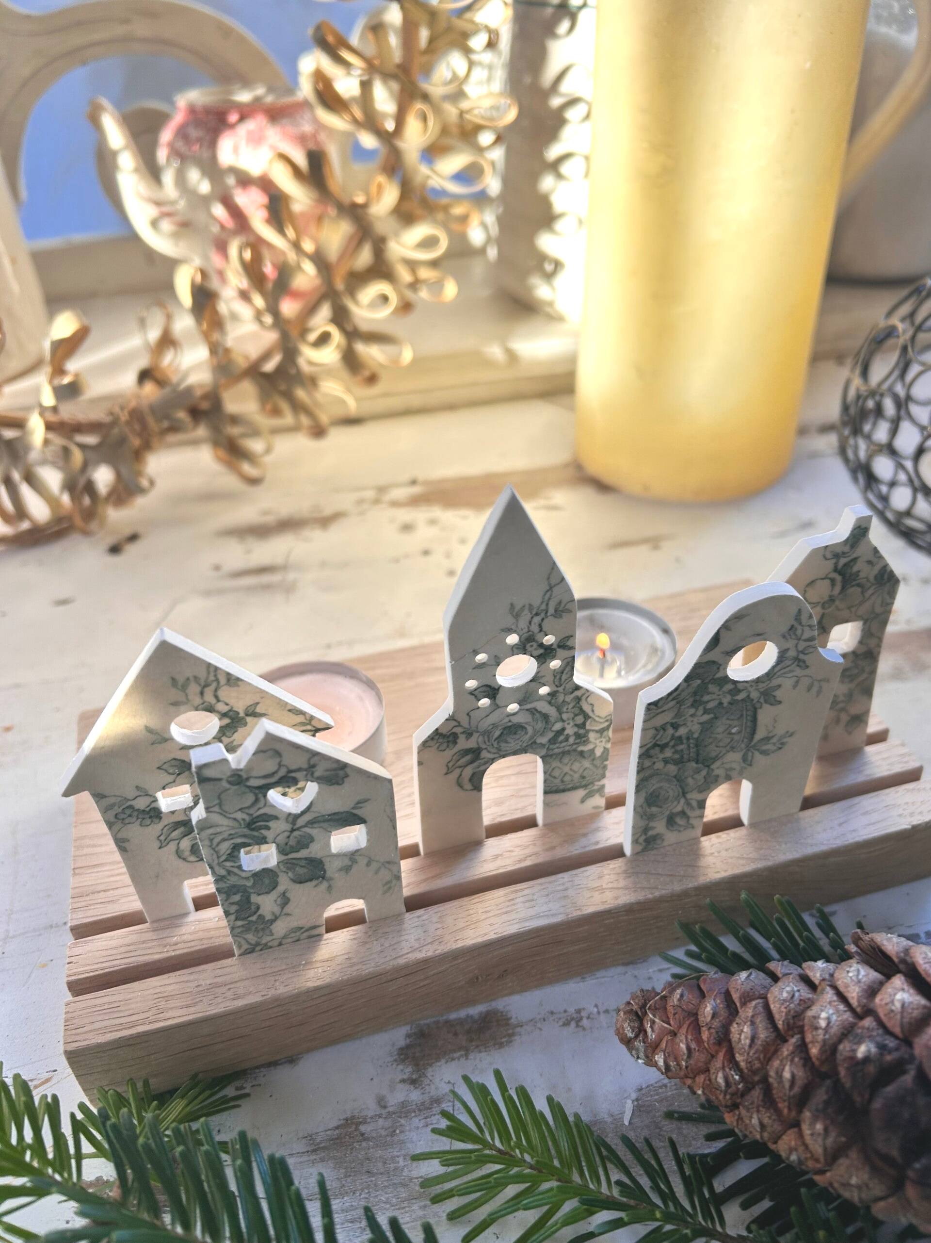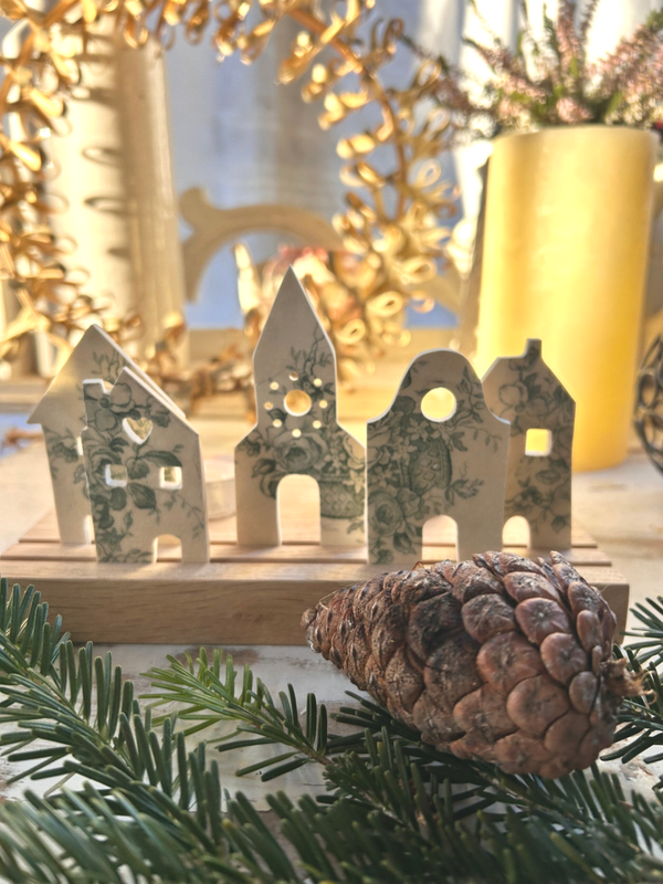 Installé sur son socle en bois, ce petit décor évoque la quiétude d’un village enneigé, où la lumière semble prête à danser derrière chaque fenêtre.