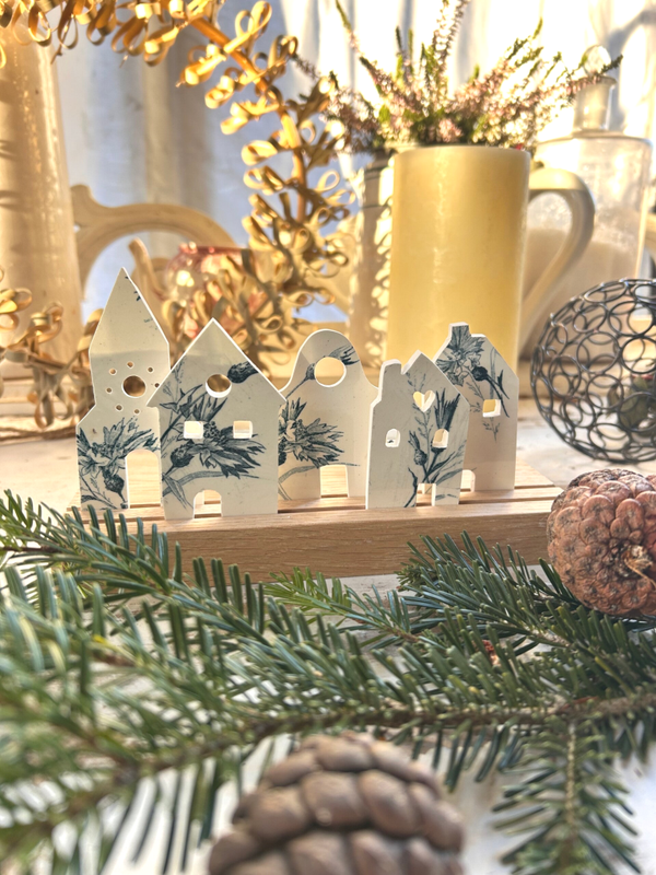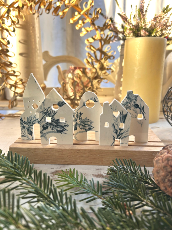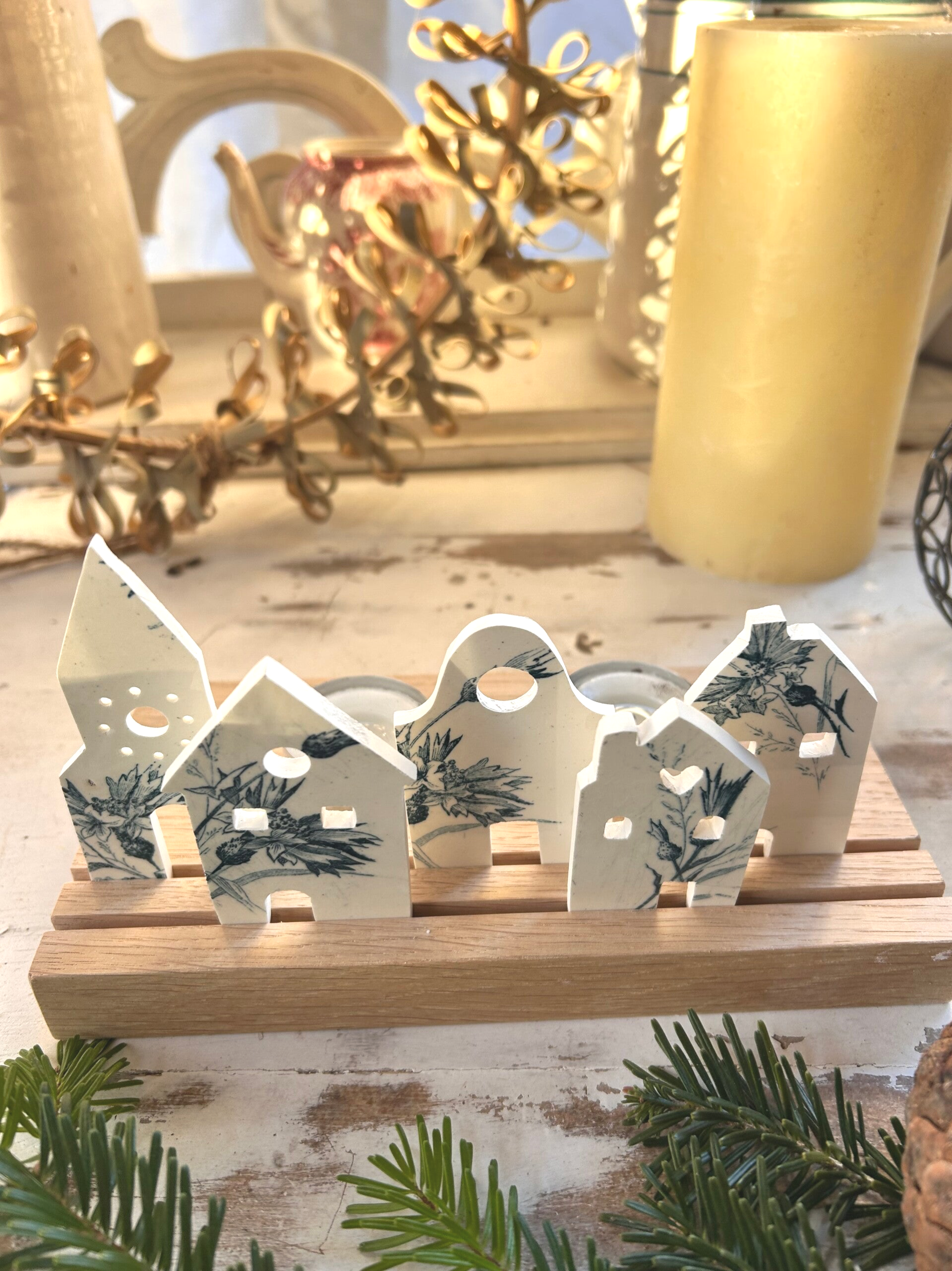 Les motifs floraux caractéristiques de ce modèle, dans des tons de bleu, viennent habiller avec délicatesse les quatrepetites maisons et leur église centrale, créant une scène empreinte de poésie et de nostalgie.