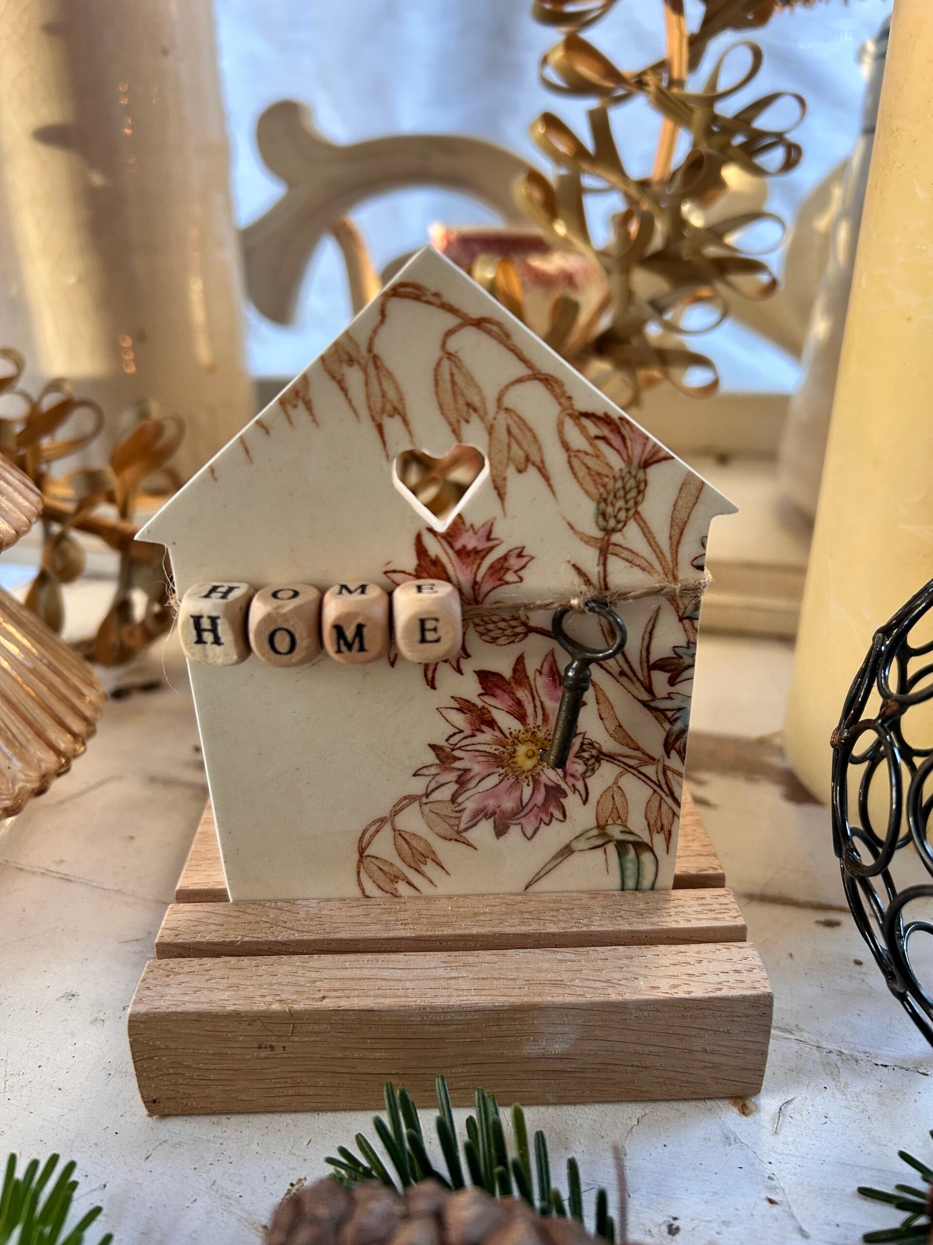 Petite maison poétique façonnée à partir d’un fragment d’assiette ancienne Bleut de la manufacture Luneville soigneusement fixée sur un socle en chêne naturel