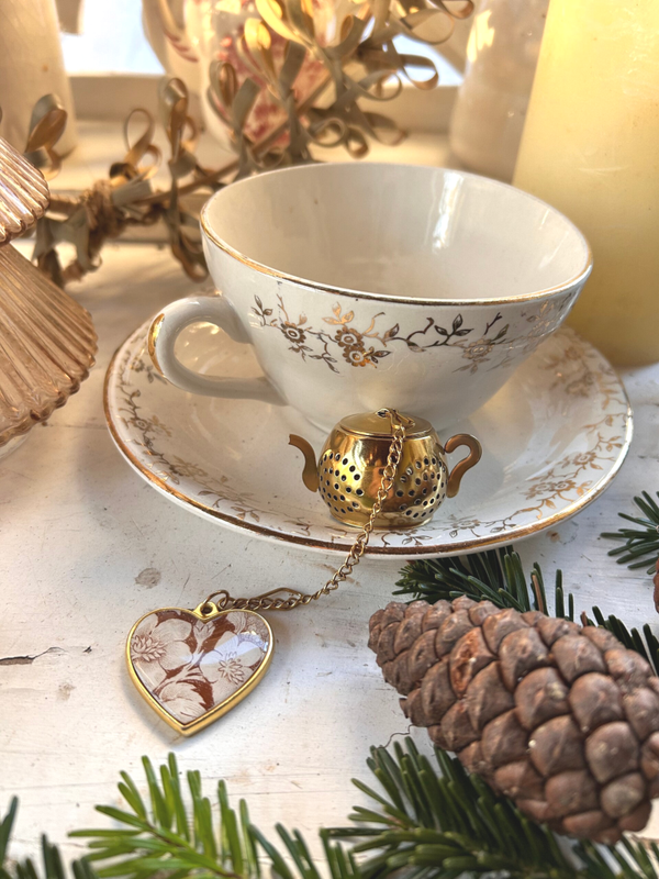 Un infuseur à thé aussi poétique qu’utile. Son pendentif en forme de cœur doré renferme un fragment d’assiette ancienne en terre de fer Pexonne modéle Jardinière
