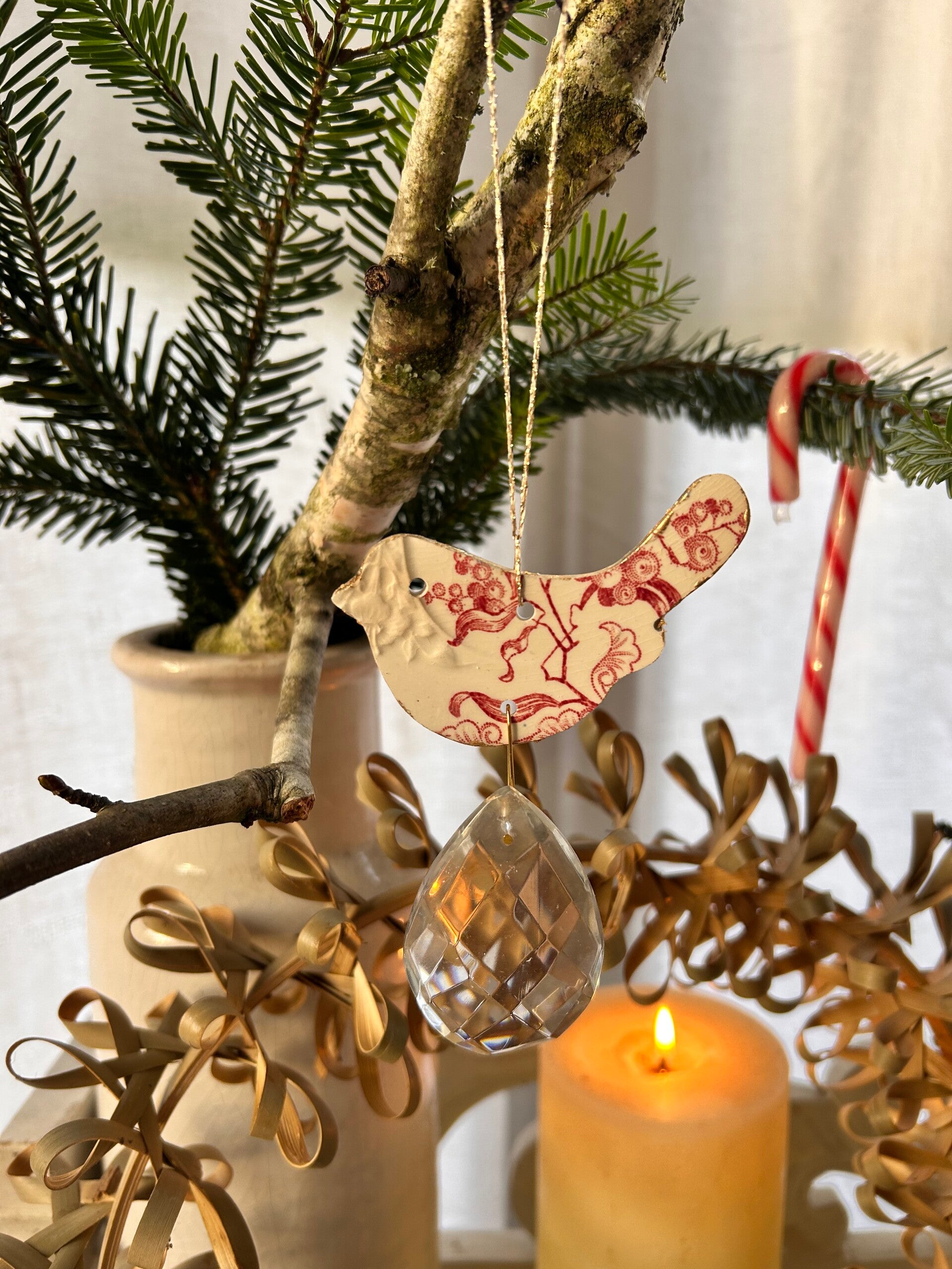 Cette suspension représente un petit oiseau taillé à la main dans de la faïence ancienne, mettant en valeur le charme des motifs d’époque et la douceur du craquelé naturel.