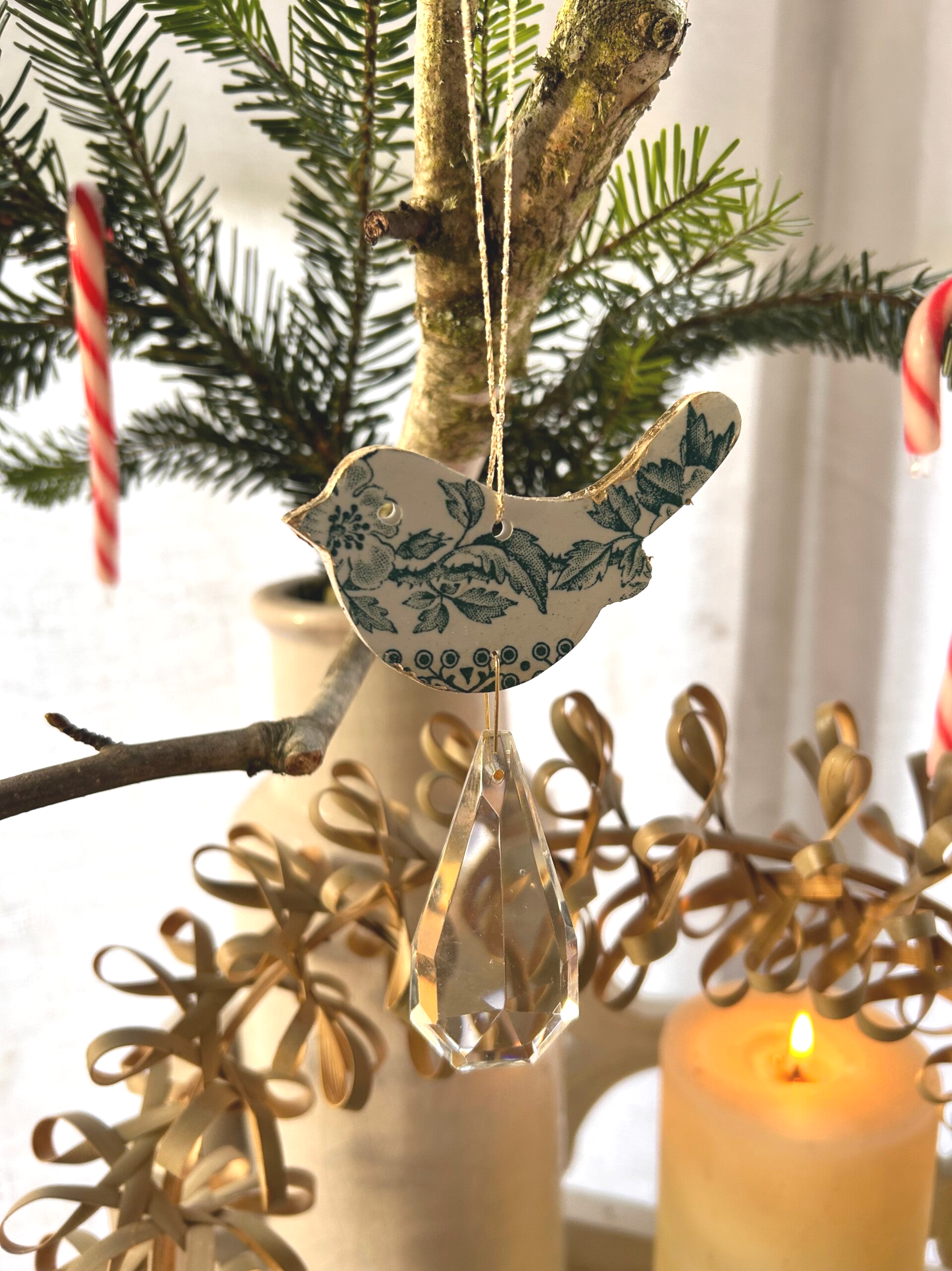 Cette suspension représente un petit oiseau taillé à la main dans de la faïence ancienne, mettant en valeur le charme des motifs d’époque et la douceur du craquelé naturel.
