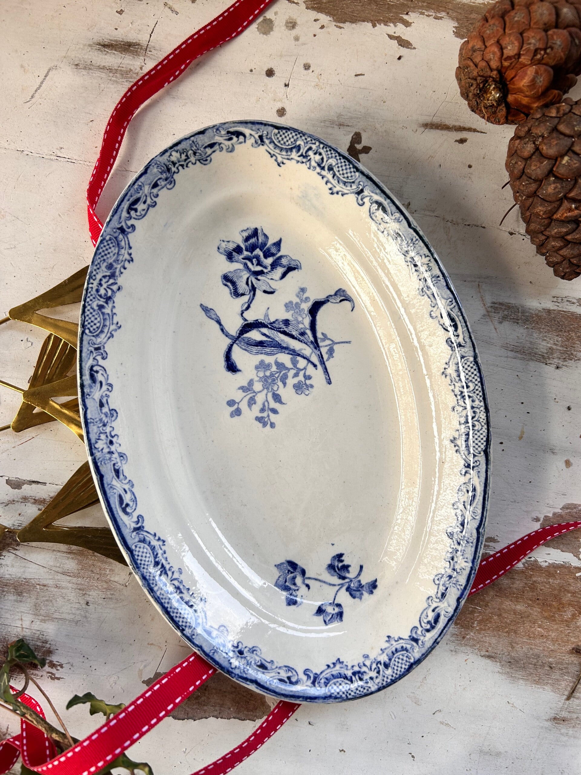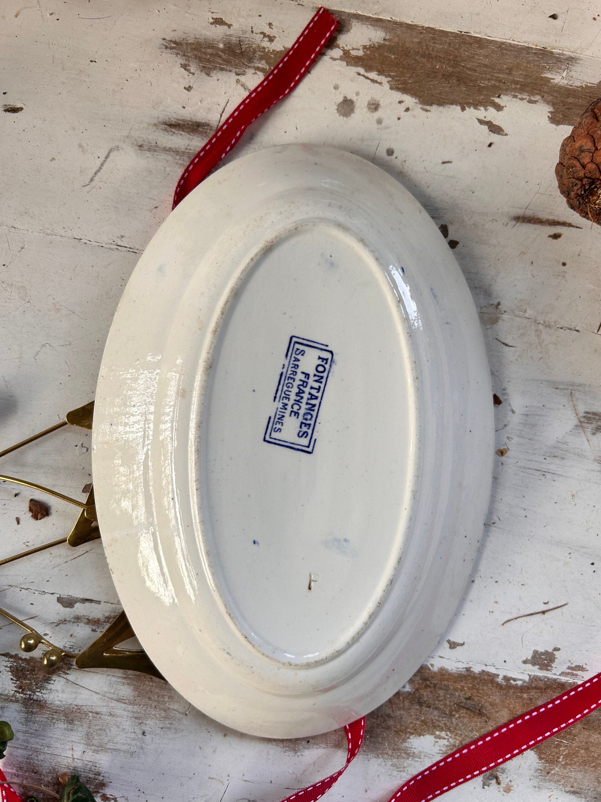 Charmant ravier ovale de la célèbre manufacture Sarreguemines, modèle Fontangeen décor bleu. Une pièce élégante et lumineuse, idéale pour compléter une collection ou apporter une touche authentique à une table traditionnelle.