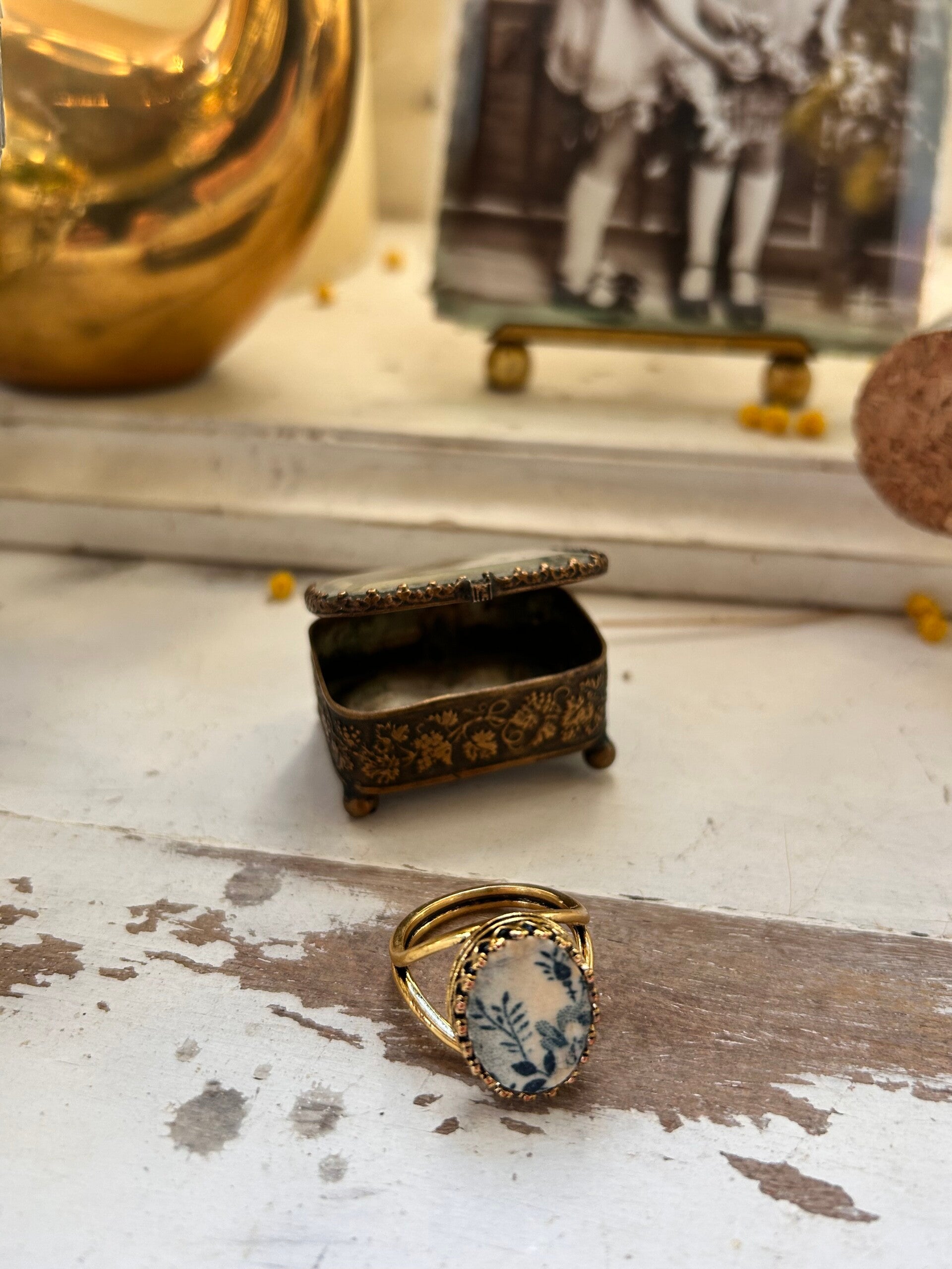 Bague de style rétro. Son cabochon est taillé dans une assiette Clairefontaine modéle indiana patiné par le temps passé