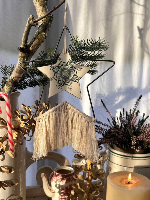 Elle est accrochée à étoile métallique. Du coton façon macramé vient souligner le tout