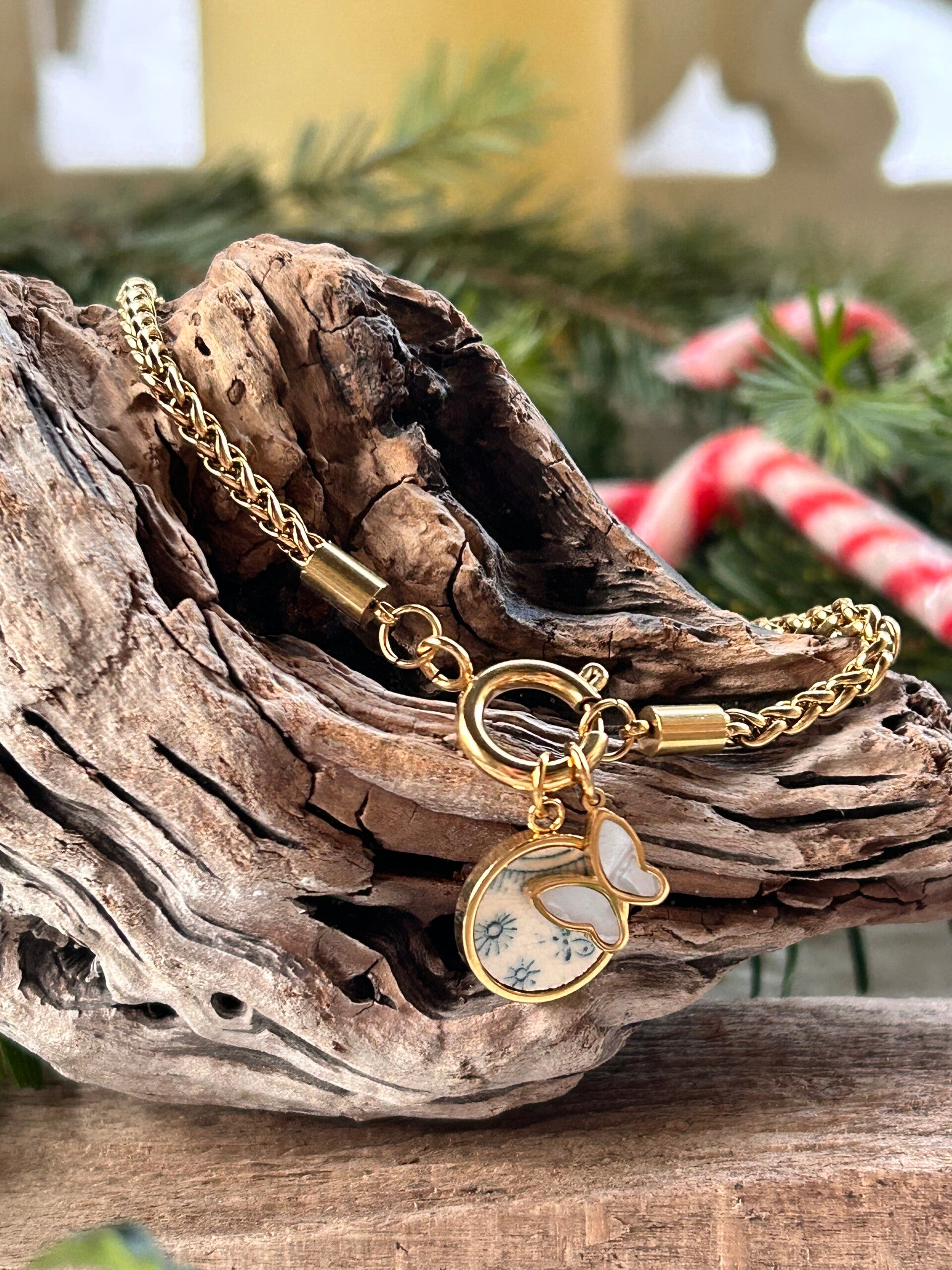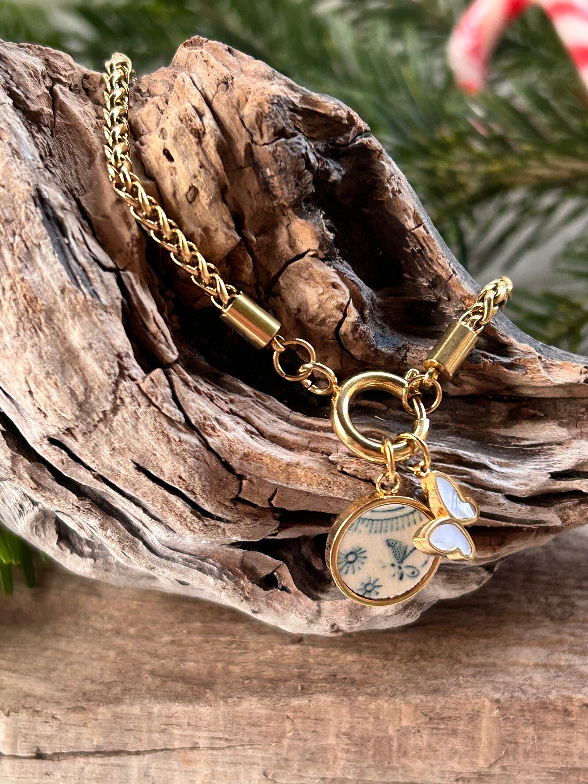 Ce bracelet délicat est orné d’un médaillon entièrement taillé et façonné à la main dans une assiette ancienne en faïence Longwy modéle evantail. Chaque fragment est découpé, poncé et poli pour devenir un petit bijou chargé d’histoire.