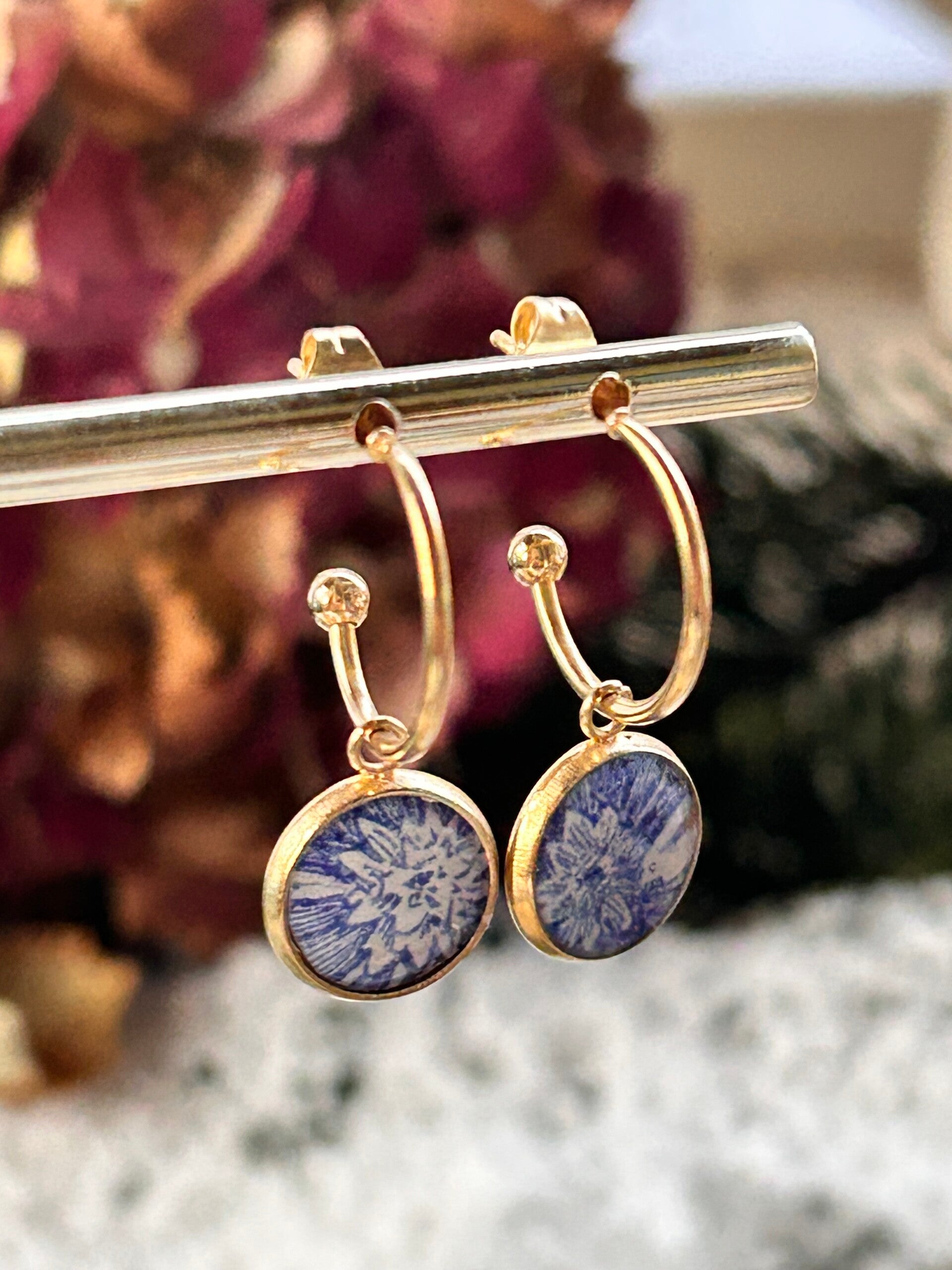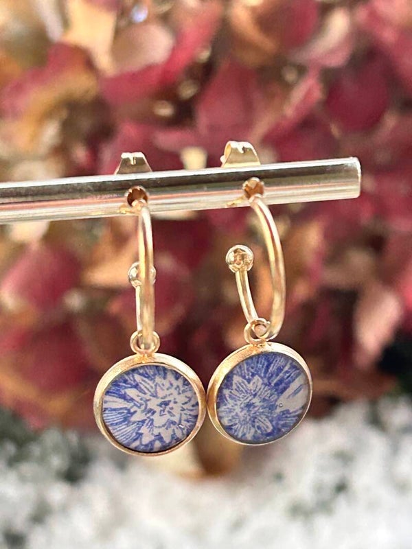 • Paire de boucles d’oreilles délicates composées de petits médaillons taillés à la main dans de la faïence ancienne.
