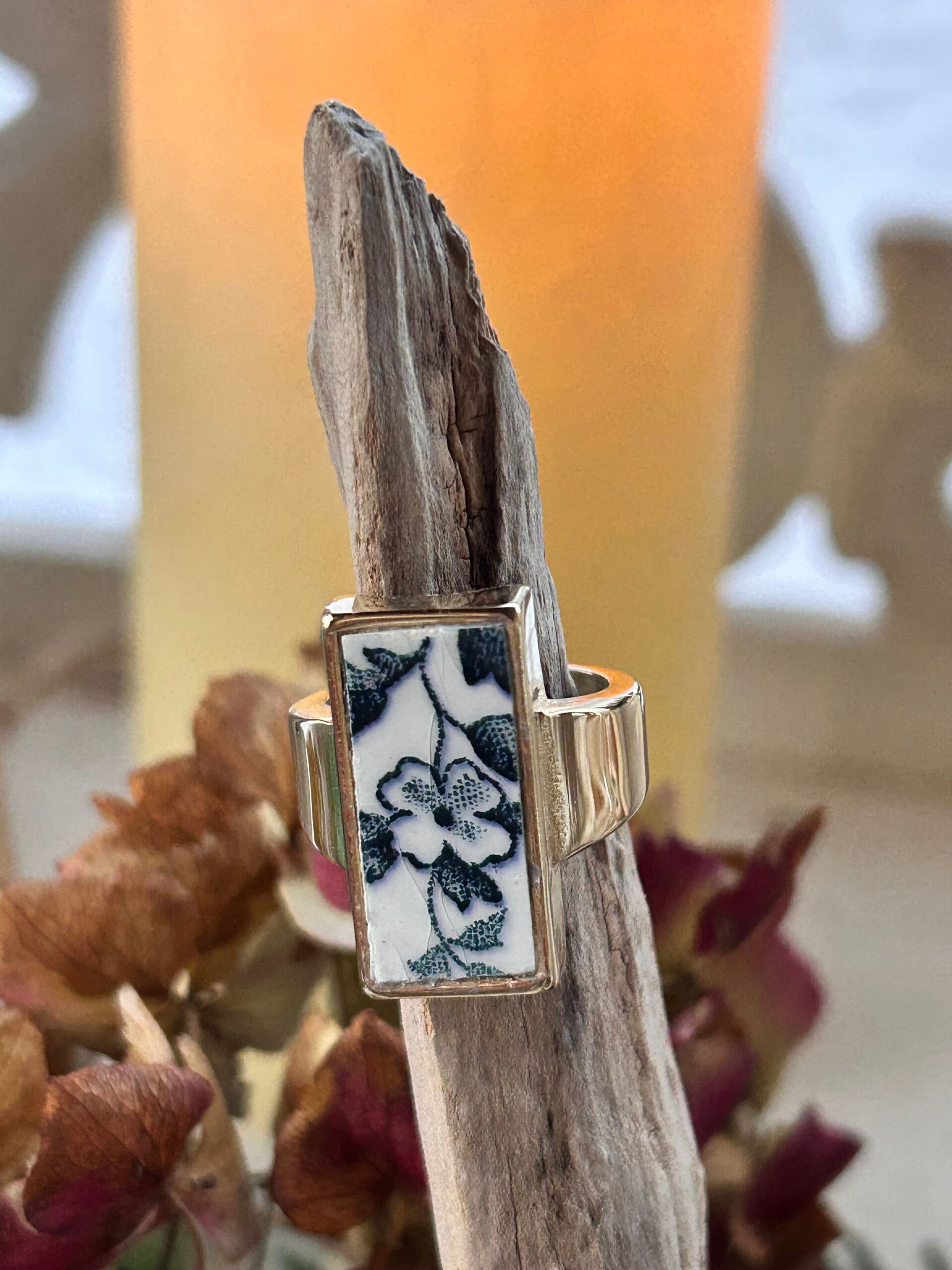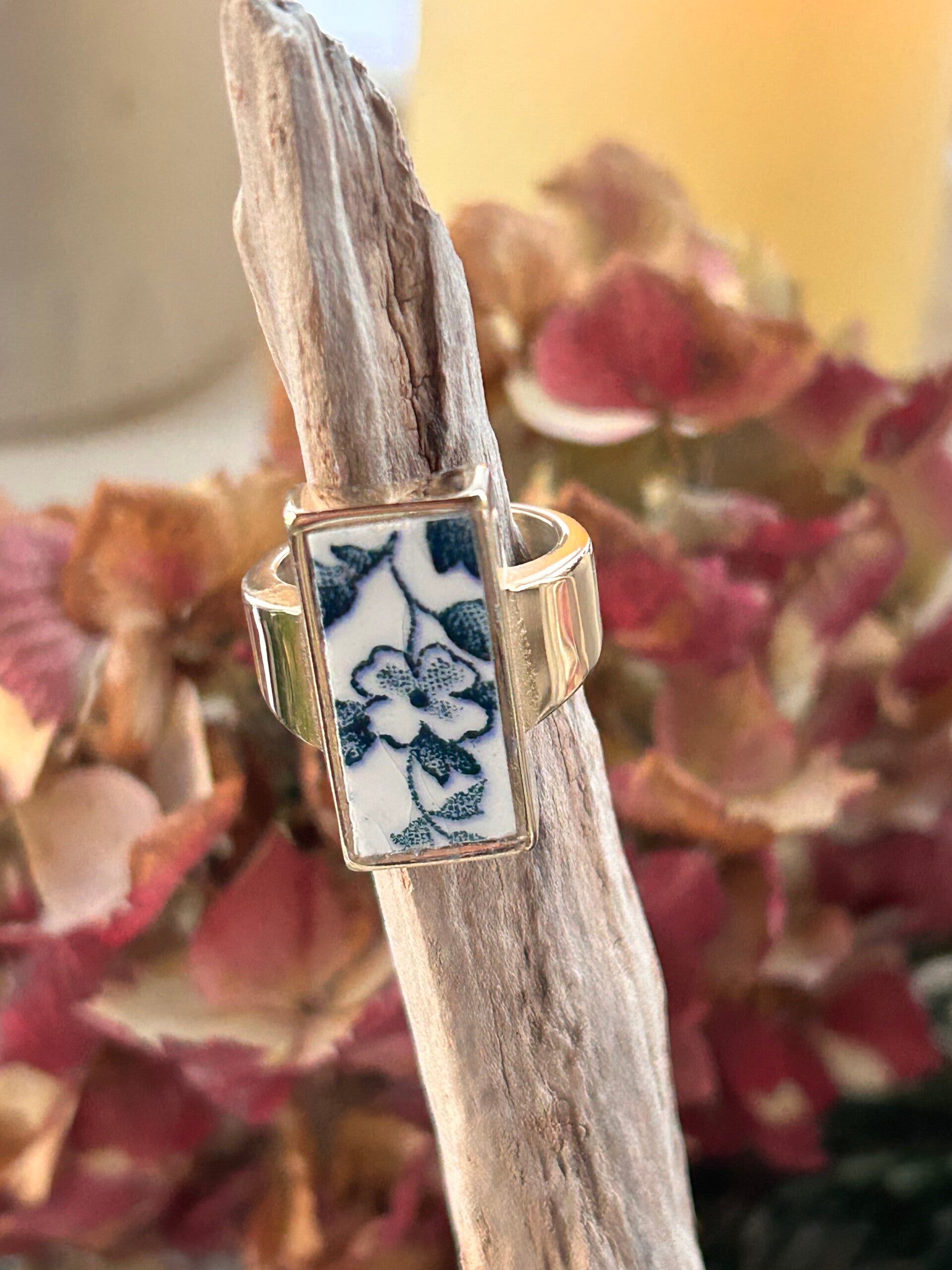 Cette bague dorée met en valeur un fragment authentique d’assiette Moulin des Loups – modèle Marie-Louise, soigneusement taillé, poncé et poli à la main.