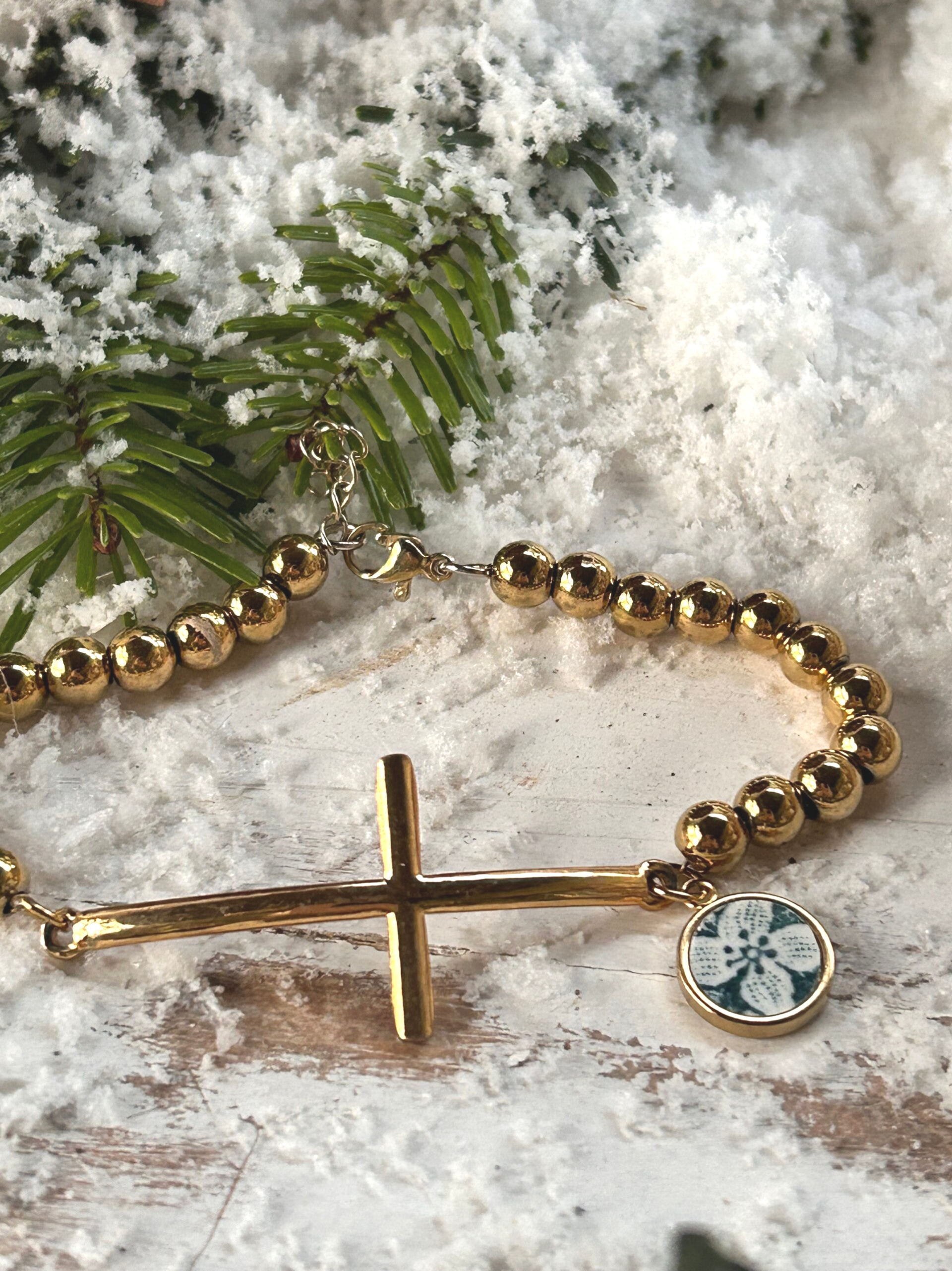 Bracelet croix dorée & médaillon en faïence ancienne
