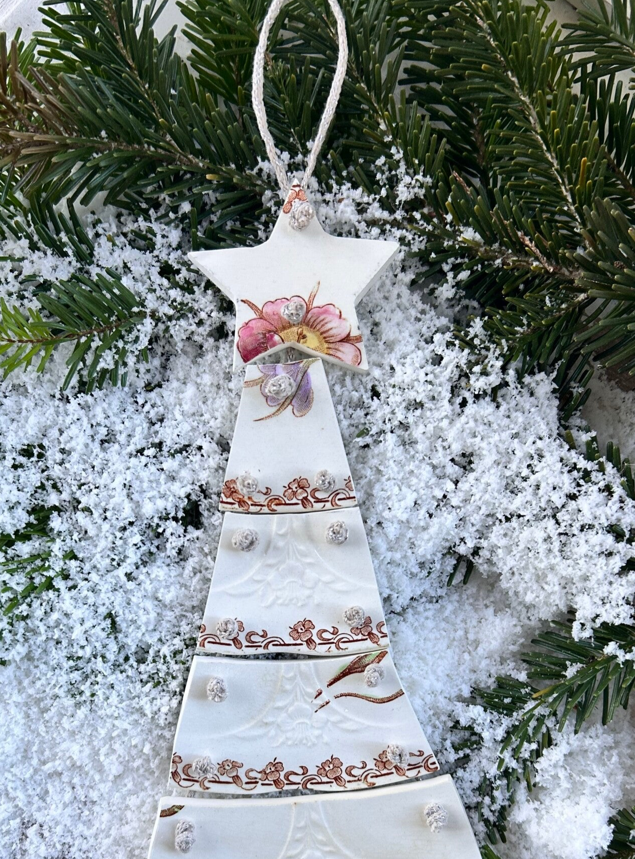 Chaque fragment de faïence, soigneusement découpé puis articulé, compose un sapin, une décoration poétique et authentique à suspendre ou à poser.